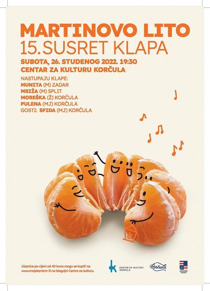 Centar za kulturu Korčula vas poziva na 15. Susret klapa "Martinovo lito" u subotu, 26.11.2022. u Domu kulture u Korčuli s početkom u 19:30 sati.