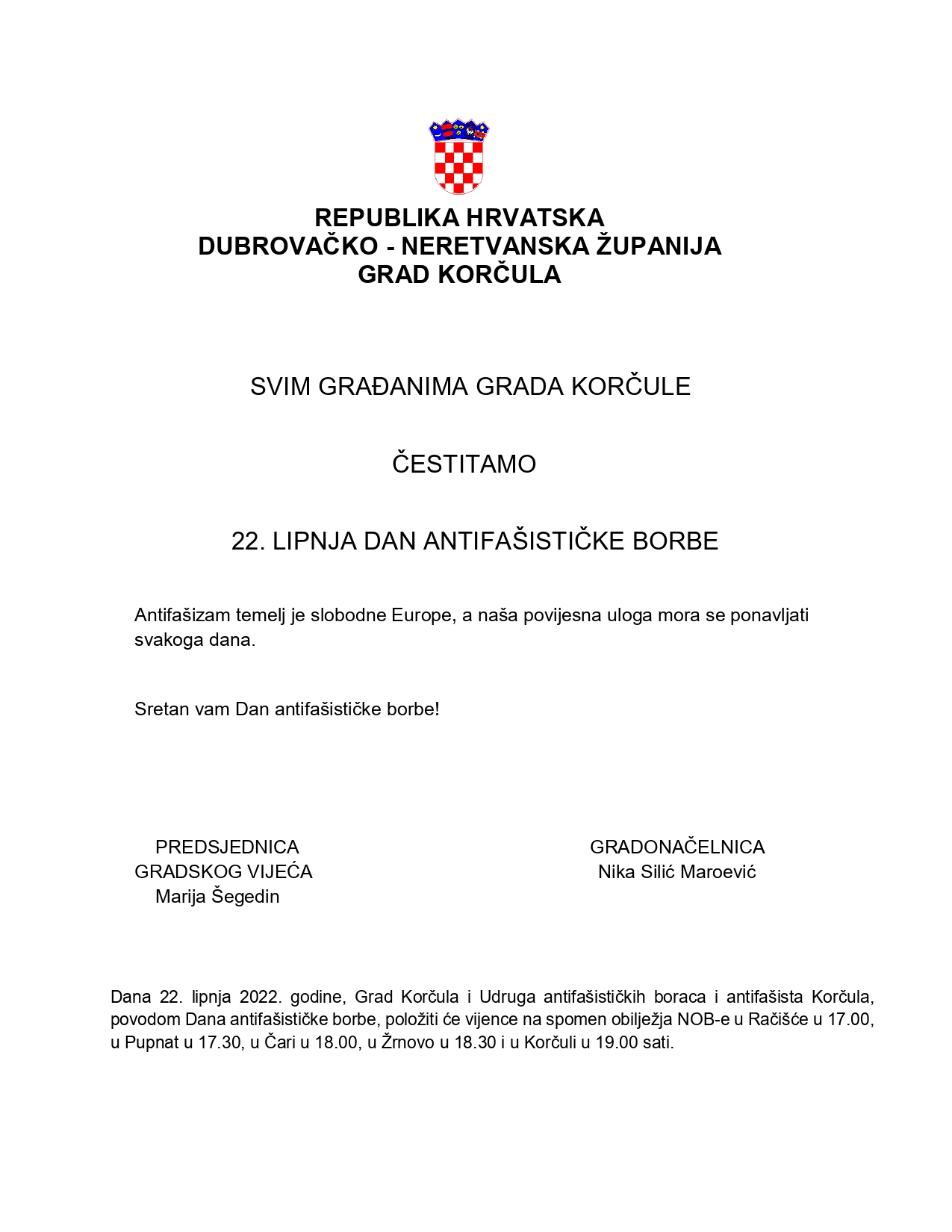 Dana 22. lipnja 2022. godine, Grad Korčula i Udruga antifašističkih boraca i antifašista Korčula, povodom Dana antifašističke borbe, položiti će vijence na spomen obilježja NOB-e u Račišće u 17.00, u Pupnat u 17.30, u Čari u 18.00, u Žrnovo u 18.30 i u Korčuli u 19.00 sati.