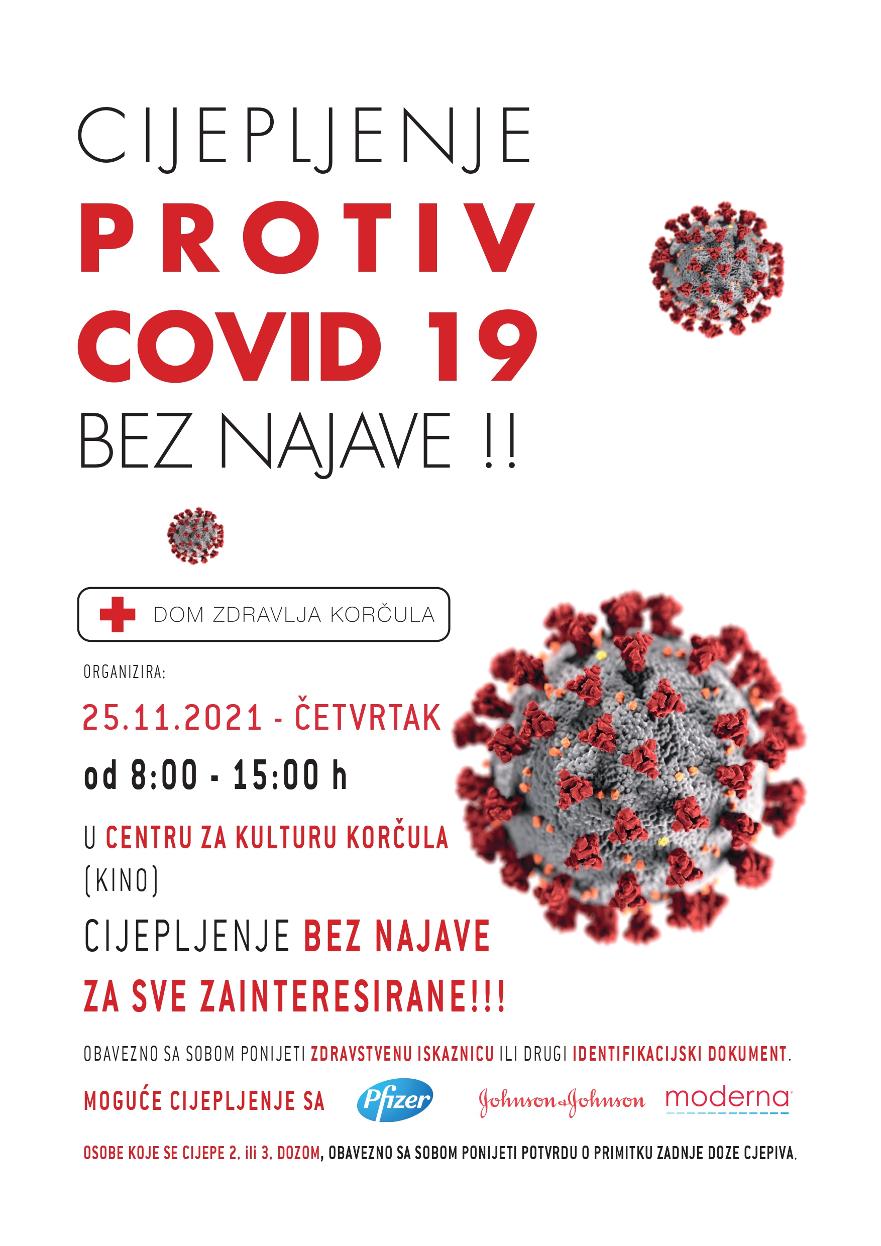 Dom zdravlja Korčula ponovno organizira cijepljenje bez najave koje će se održati 25. studenog 2021. godine (četvrtak), od 8 do 15h u Centru za kulturu Korčula (kino).