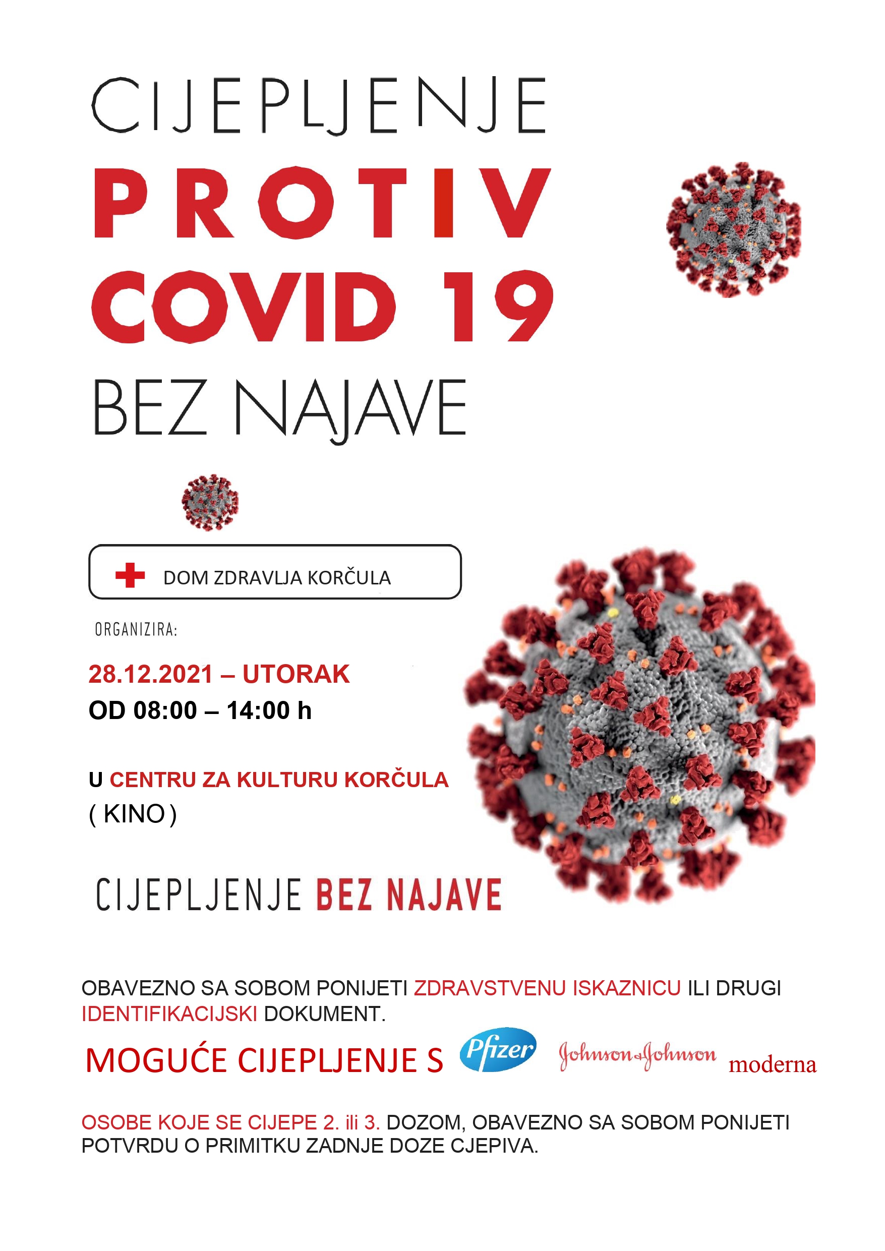 Dom zdravlja Korčula ponovno organizira cijepljenje bez najave koje će se održati 28. prosinca 2021. godine (utorak), od 8 do 14h u Centru za kulturu Korčula (kino).
