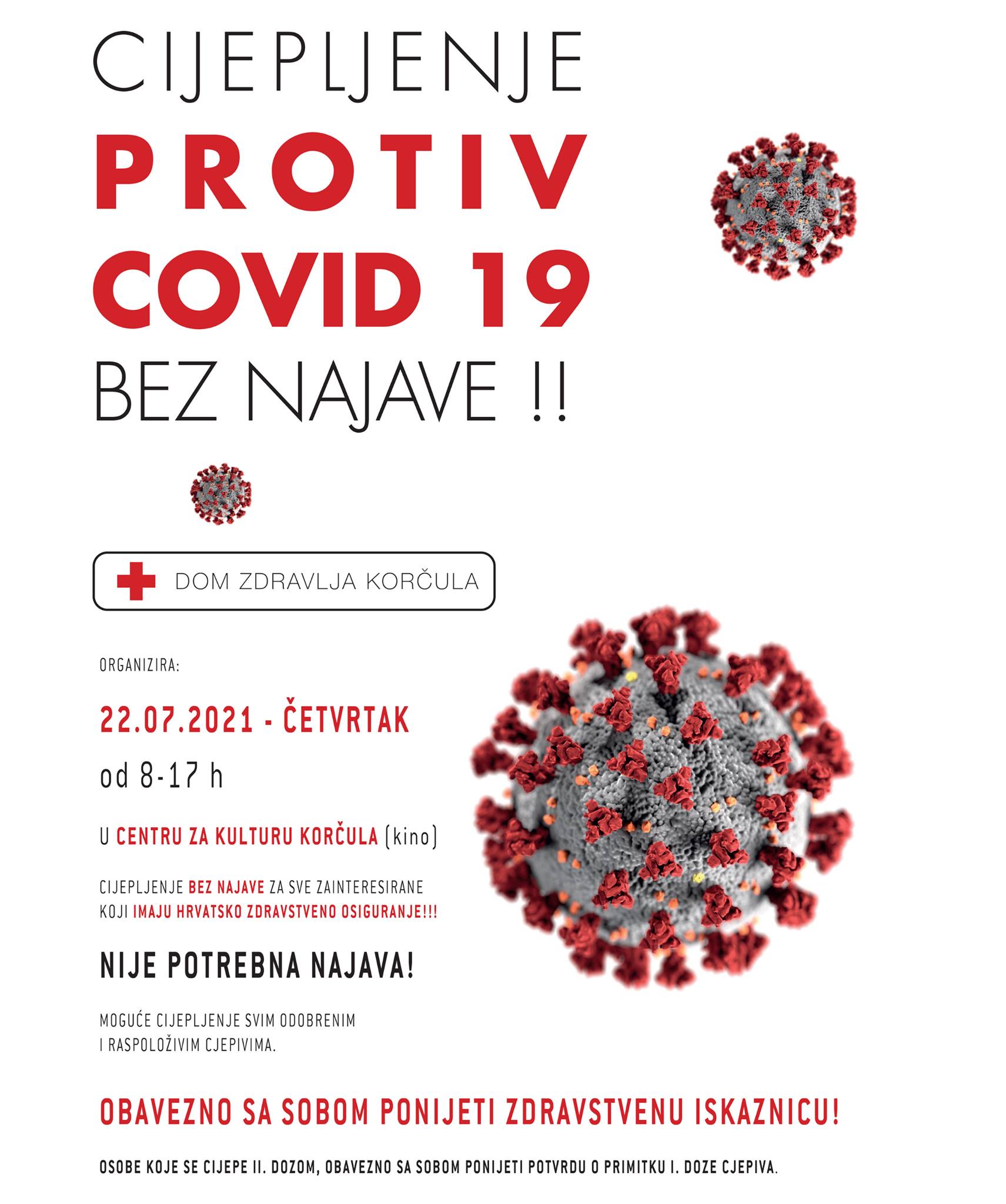 Dom zdravlja Korčula organizira 22. srpnja 2021. godine (četvrtak) od 8-17 h u Centru za kulturu Korčula (Kino) cijepljenje bez najave.