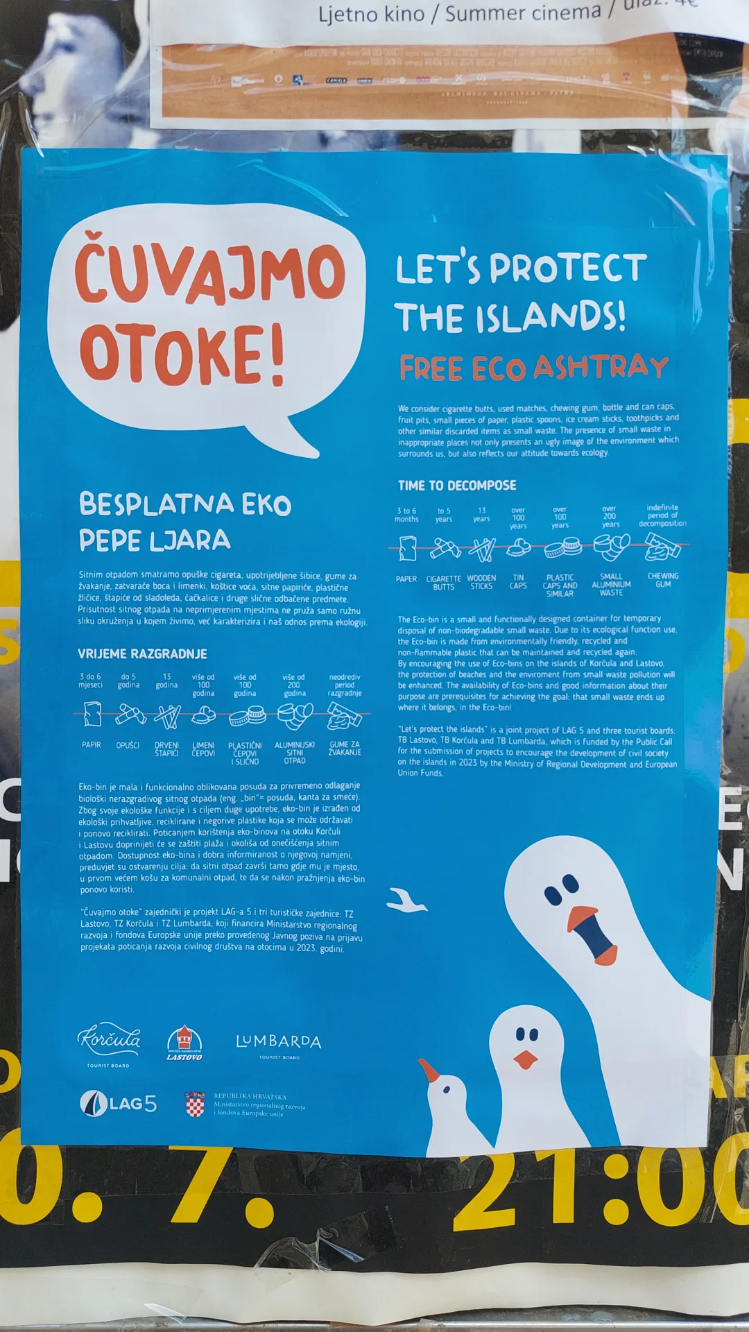 Projektom je osigurano 2100 komada eko-bin pepeljara za plaže i izrada i tisak naljepnica za njih, izrada i tisak dvojezičnih plakata i letaka kojima bi se posjetitelji i lokalno stanovništvo informirali o štetnosti ostavljanja opušaka u prirodi, ali i ostalim sličnim po okoliš štetnim ponašanjima. Sav tiskani materijal ima logo donatora, a distribucija svih materijala započela je nedavno u suradnji s lokalnim pružateljima turističkih usluga (agencije, iznajmljivači, ugostitelji, OPG-ovi, obrti) te u uredima Turističke zajednice Općine Lastovo, Općine Lumbarda i grada Korčule.