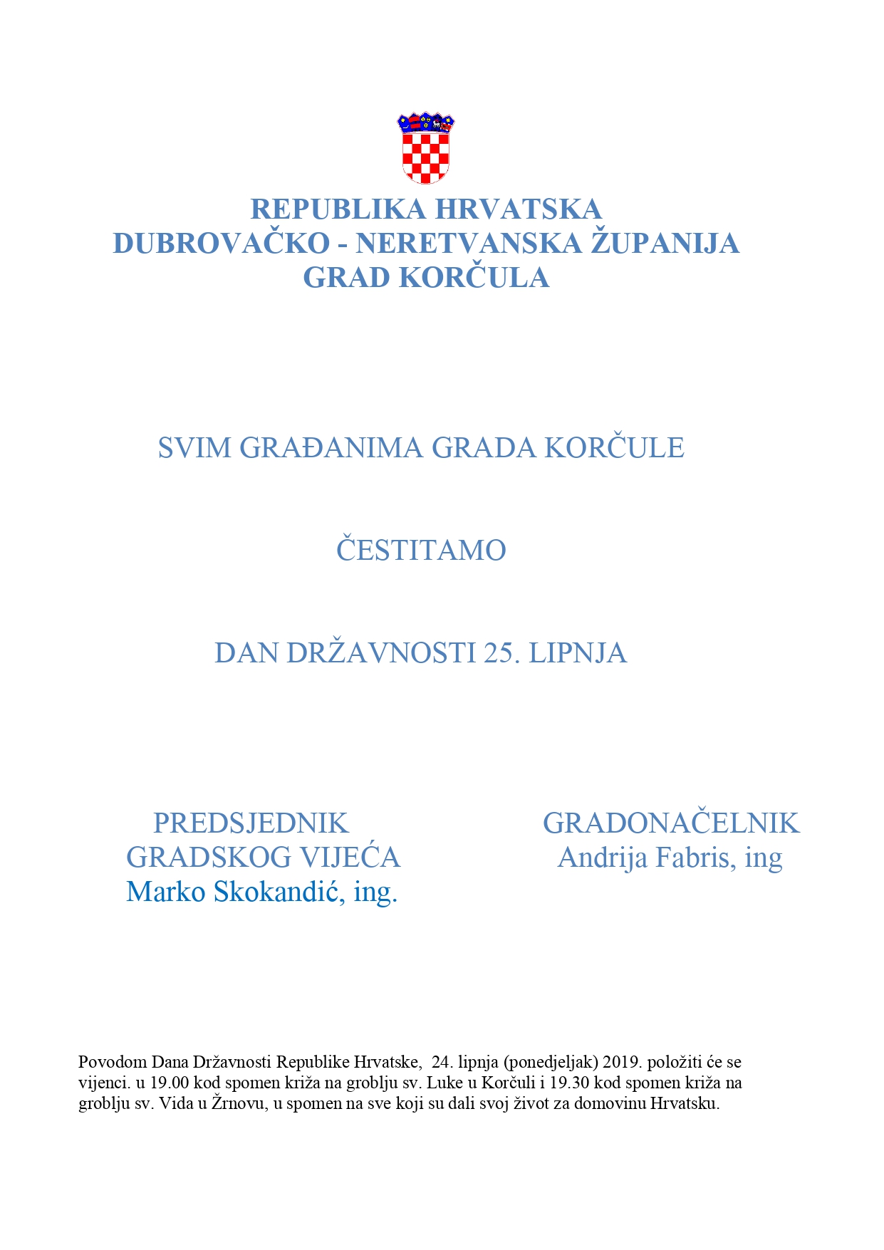 Svim građanima Grada Korčule čestitamo Dan državnosti Republike Hrvatske!