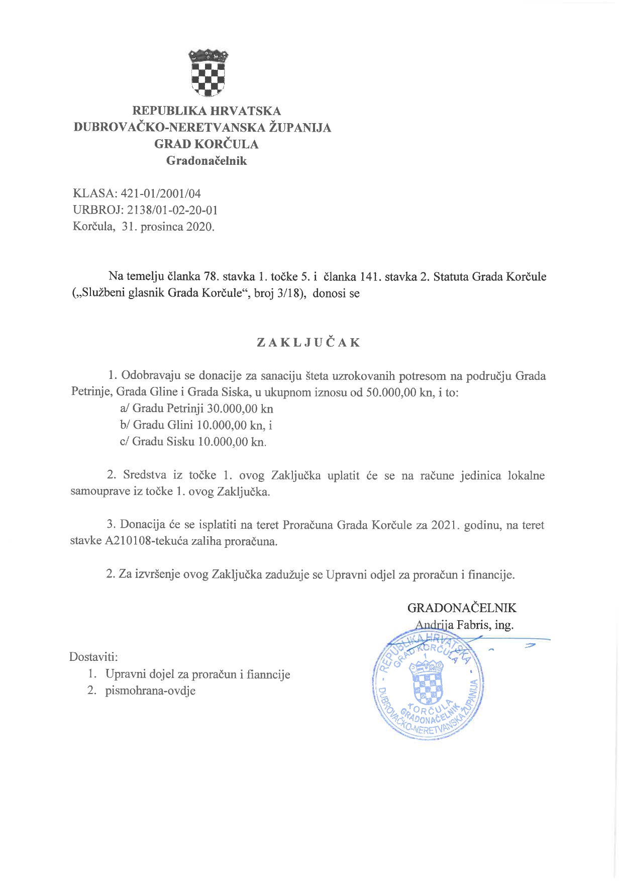 Gradonačelnik Grada Korčule donio je Zaključak kojim se odobravaju donacije za sanaciju šteta uzrokovanih potresom na području Grada Petrinje, Grada Gline i Grada Siska u ukupnom iznosu od 50.000,00 kn.