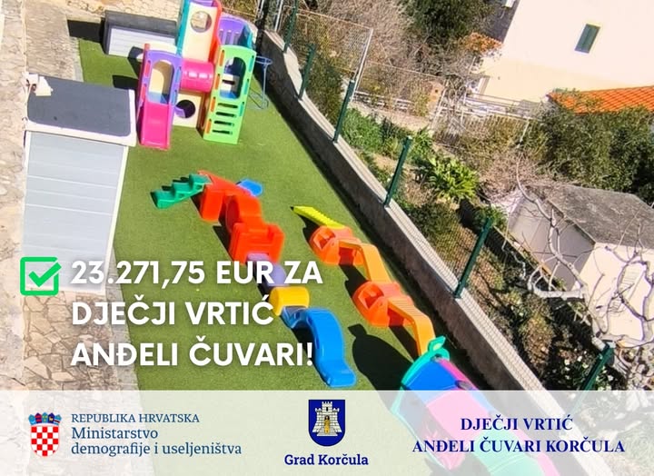 Grad Korčula, u partnerstvu s Dječjim vrtićem "Anđeli čuvari", uspješno je prijavio projekt uređenja vanjskog prostora za igru uz objekt dječjeg vrtića na poziv "𝐷𝑜𝑠𝑡𝑢𝑝𝑛𝑜𝑠𝑡 𝑘𝑣𝑎𝑙𝑖𝑡𝑒𝑡𝑛𝑒 𝑠𝑘𝑟𝑏𝑖 𝑧𝑎 𝑑𝑗𝑒𝑐𝑢 𝑢 𝑙𝑜𝑘𝑎𝑙𝑛𝑖𝑚 𝑧𝑎𝑗𝑒𝑑𝑛𝑖𝑐𝑎𝑚𝑎 𝑘𝑟𝑜𝑧 𝑝𝑜𝑏𝑜𝑙𝑗𝑠̌𝑎𝑛𝑗𝑒 𝑚𝑎𝑡𝑒𝑟𝑖𝑗𝑎𝑙𝑛𝑖ℎ 𝑢𝑣𝑗𝑒𝑡𝑎 𝑢 𝑑𝑗𝑒𝑐̌𝑗𝑖𝑚 𝑣𝑟𝑡𝑖𝑐́𝑖𝑚𝑎", Ministarstva demografije i useljeništva.