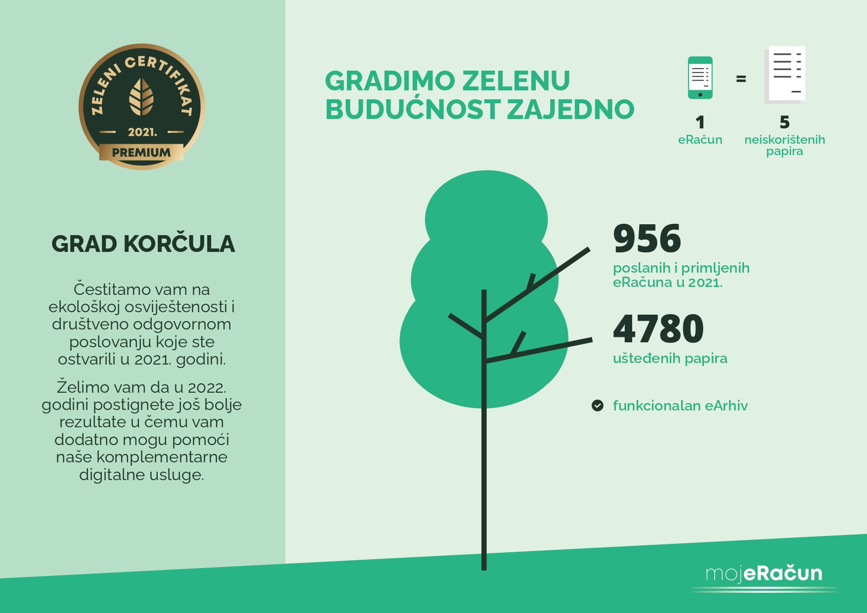 Projekt Zeleni certifikat pokrenuo je informacijski posrednik za razmjenu eRačuna i drugih digitalnih dokumenata servis moj-eRačun u suradnji sa svojim korisnicima i partnerima s ciljem popularizacije bespapirnog poslovanja i poticanja zaštite prirode, kao dio poslovnog identiteta među zaposlenicima, partnerima i korisnicima.