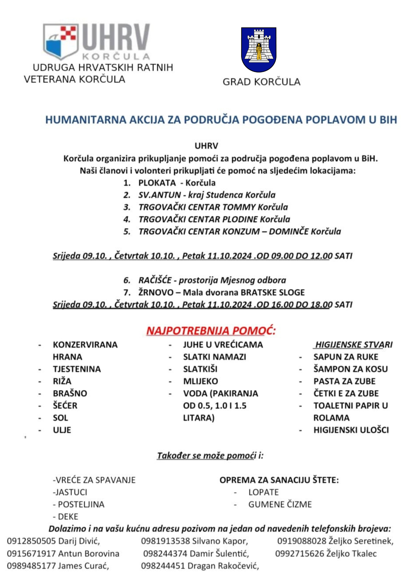Članovi i volonteri Udruge hrvatskih ratnih veterana Korčula prikupljat će pomoć u srijedu (9.10.), četvrtak (10.10.) i petak (11.10), na lokacijama koje možete pronaći u nastavku.