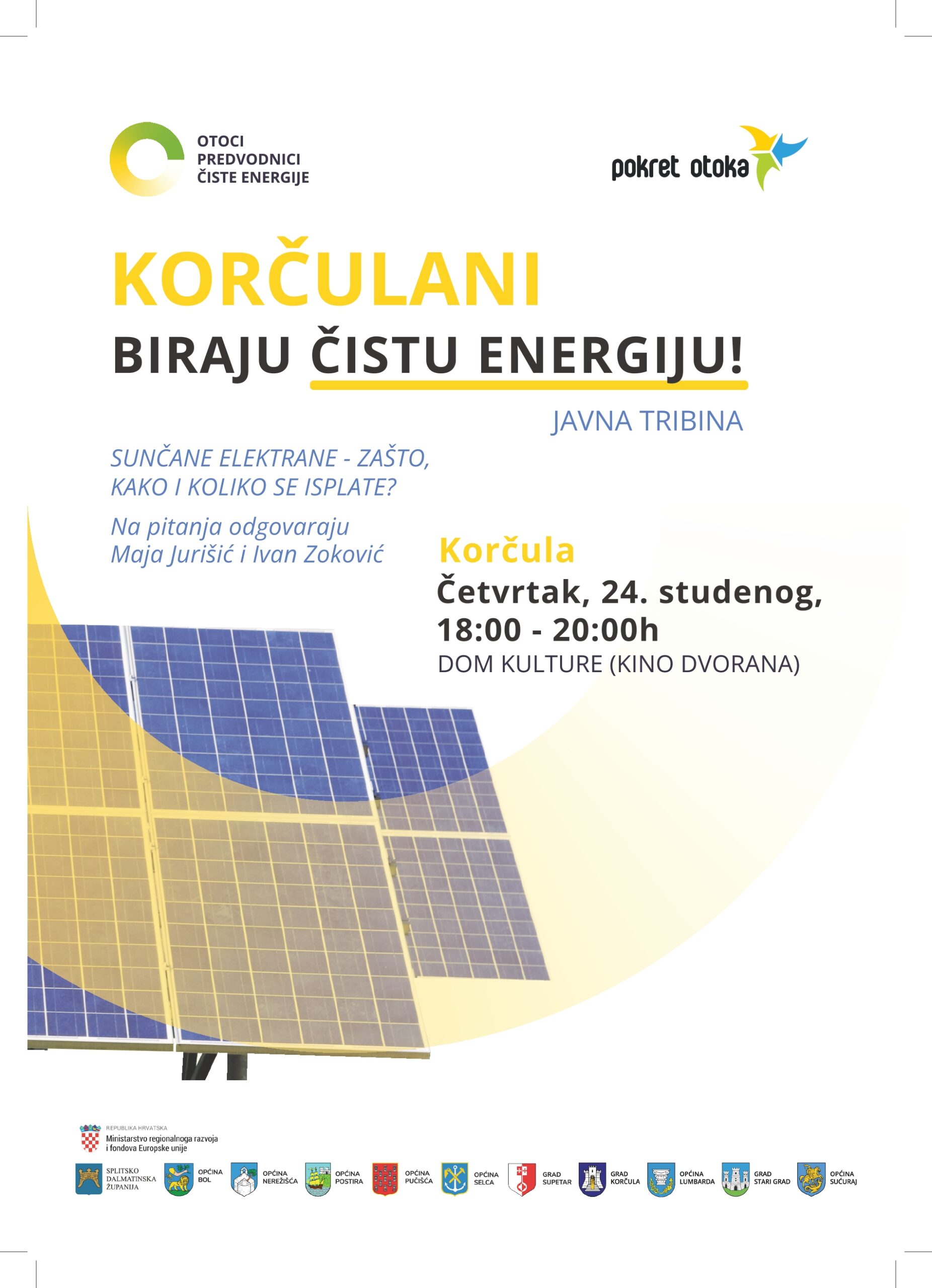 U sklopu projekta ‘’Otoci predvodnici čiste energije’’ 23. i 24. studenoga održavaju se javne tribine za stanovništvo na kojima će Korčulani dobiti odgovore što nam nosi buduće financijsko razdoblje te zašto, kako i koliko se isplati postaviti sunčanu elektranu na vlastite krovove.