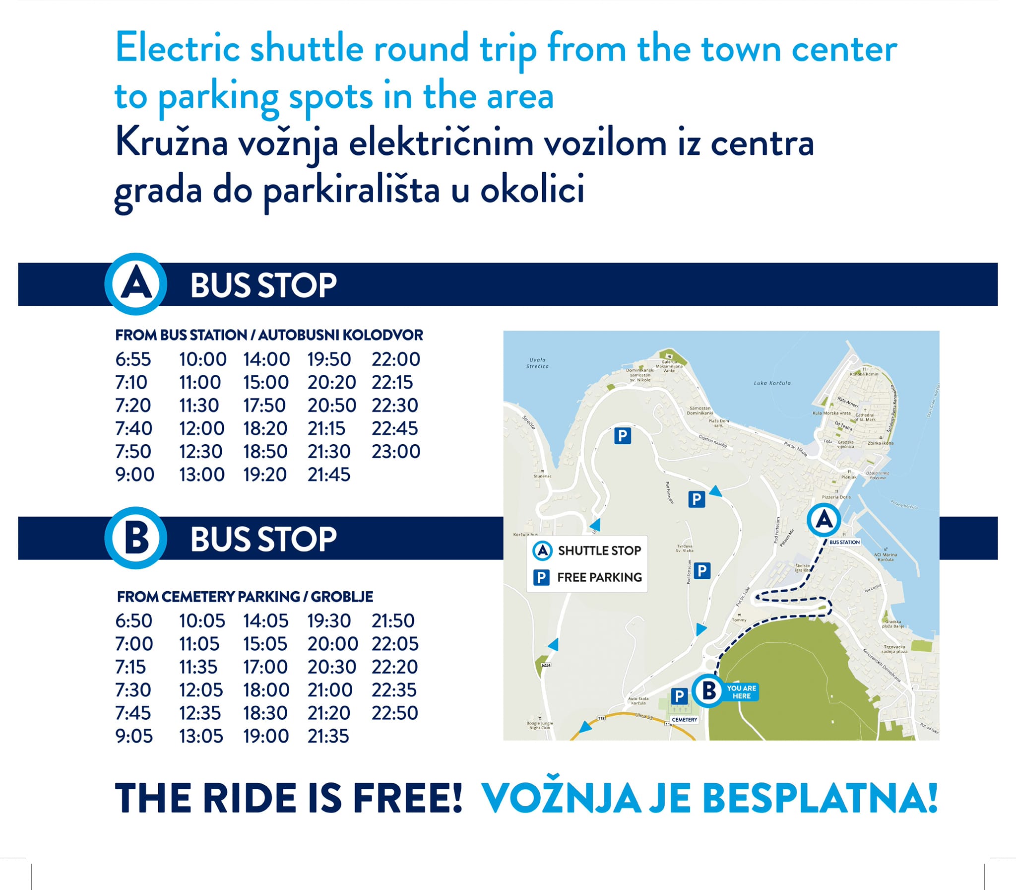U razdoblju od 15.6.2024. do 15.9.2024. svim našim sugrađanima i gostima na raspolaganju je kružni prijevoz električnim vozilom iz centra grada do parkirališta u okolici. Vožnja je besplatna.