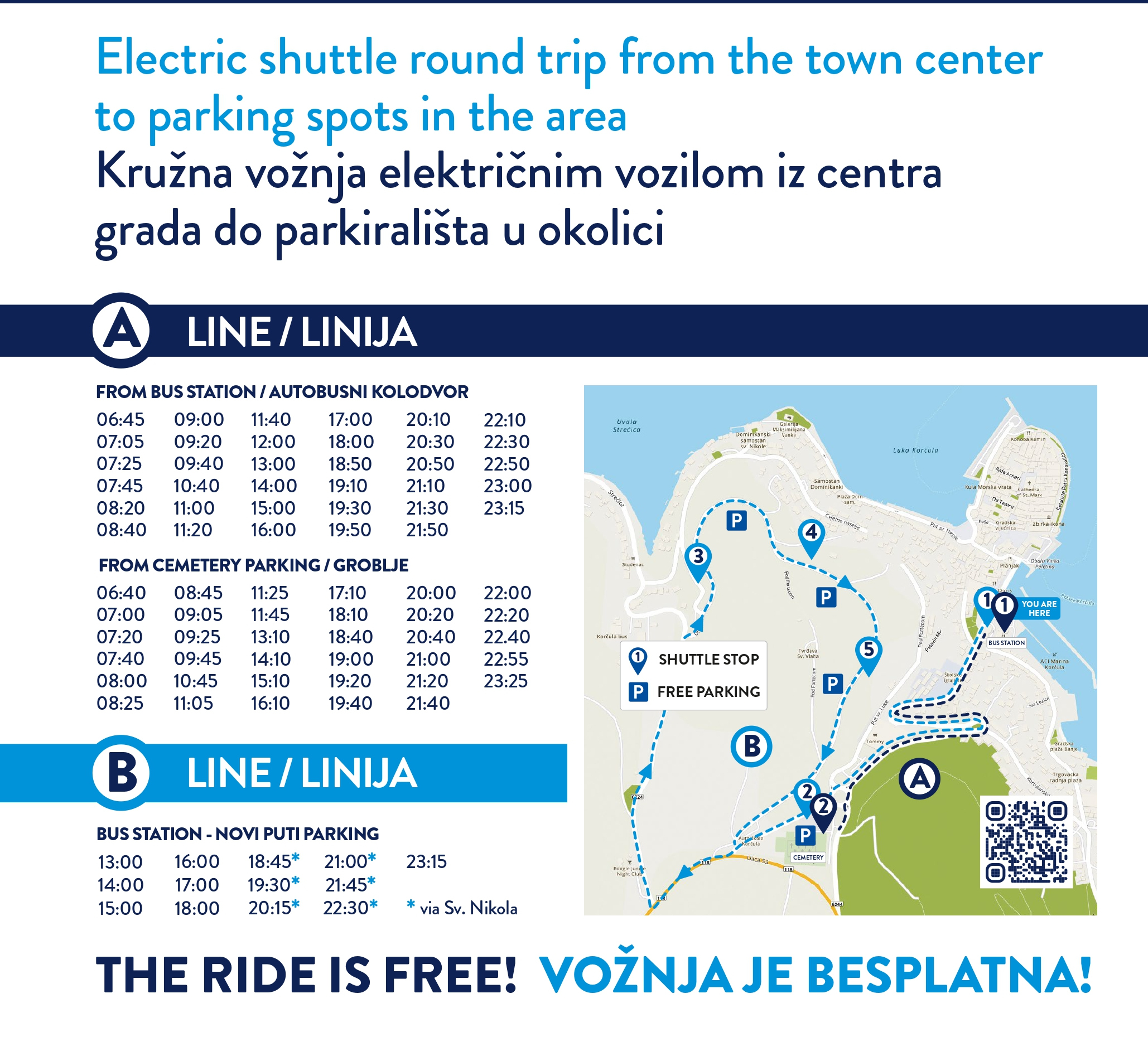 U svrhu rasterećenja prometa svim našim sugrađanima i gostima na raspolaganju je kružni prijevoz električnim vozilom iz centra grada do parkirališta u okolici.