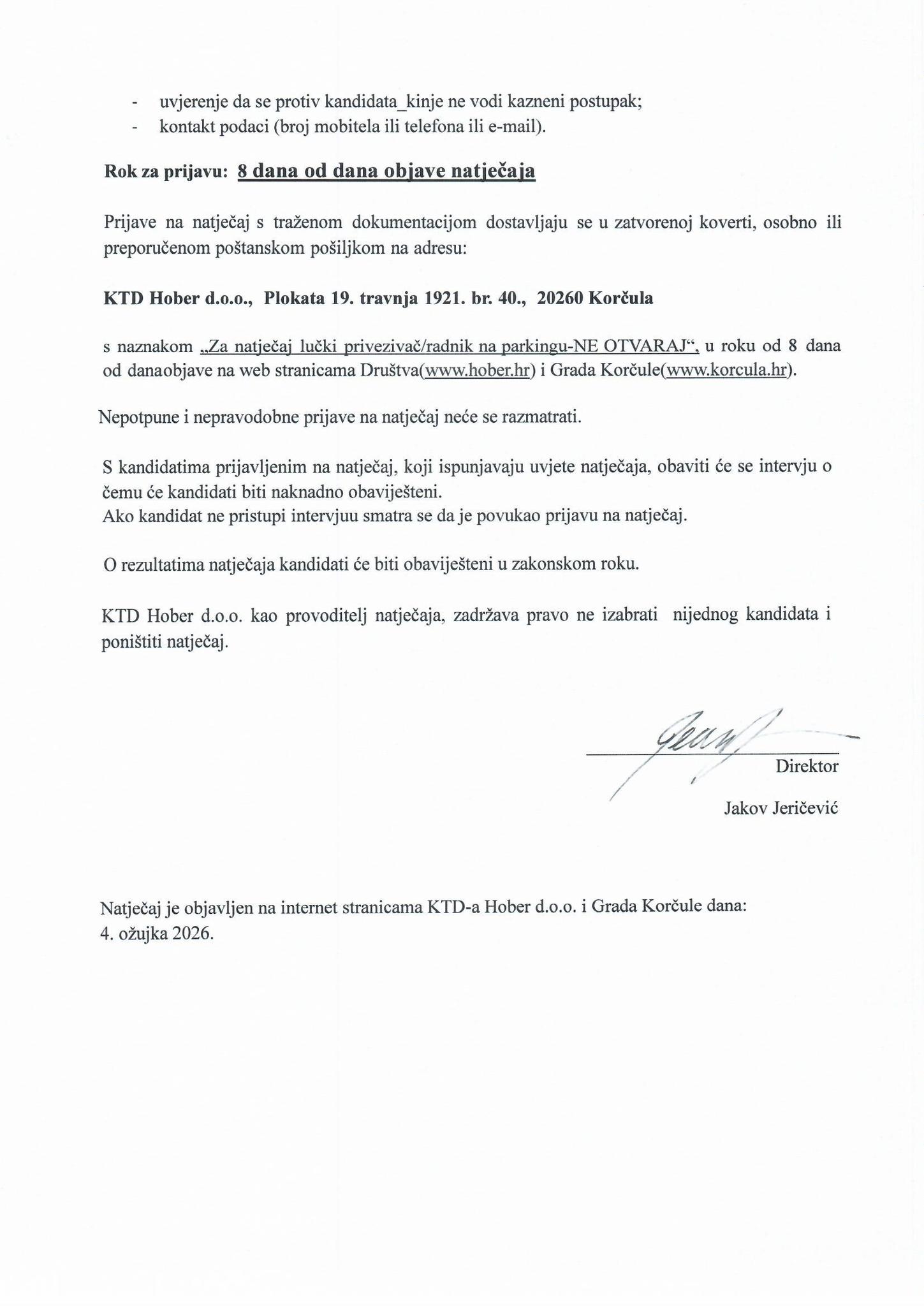 Natječaj je objavljen na internet stranicama KTD-a Hober d.o.o. i Grada Korčule dana 4. ožujka 2026.