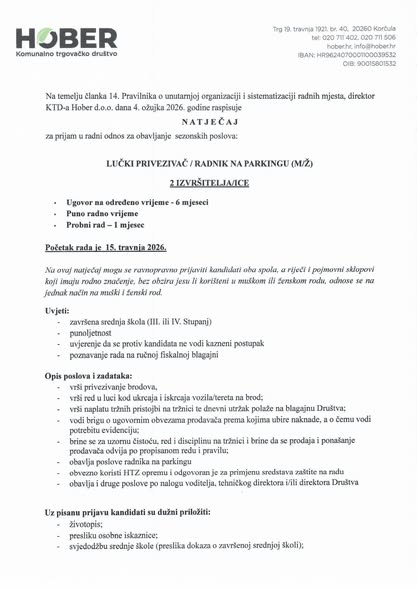 KTD Hober d.o.o., Plokata 19. travnja 1921. br. 40., 20260 Korčula s naznakom „Za natječaj lučki privezivač/radnik na parkingu-NE OTVARAJ“, u roku od 8 dana od dana objave na web stranicama Društva (www.hober.hr) i Grada Korčule (www.korcula.hr).