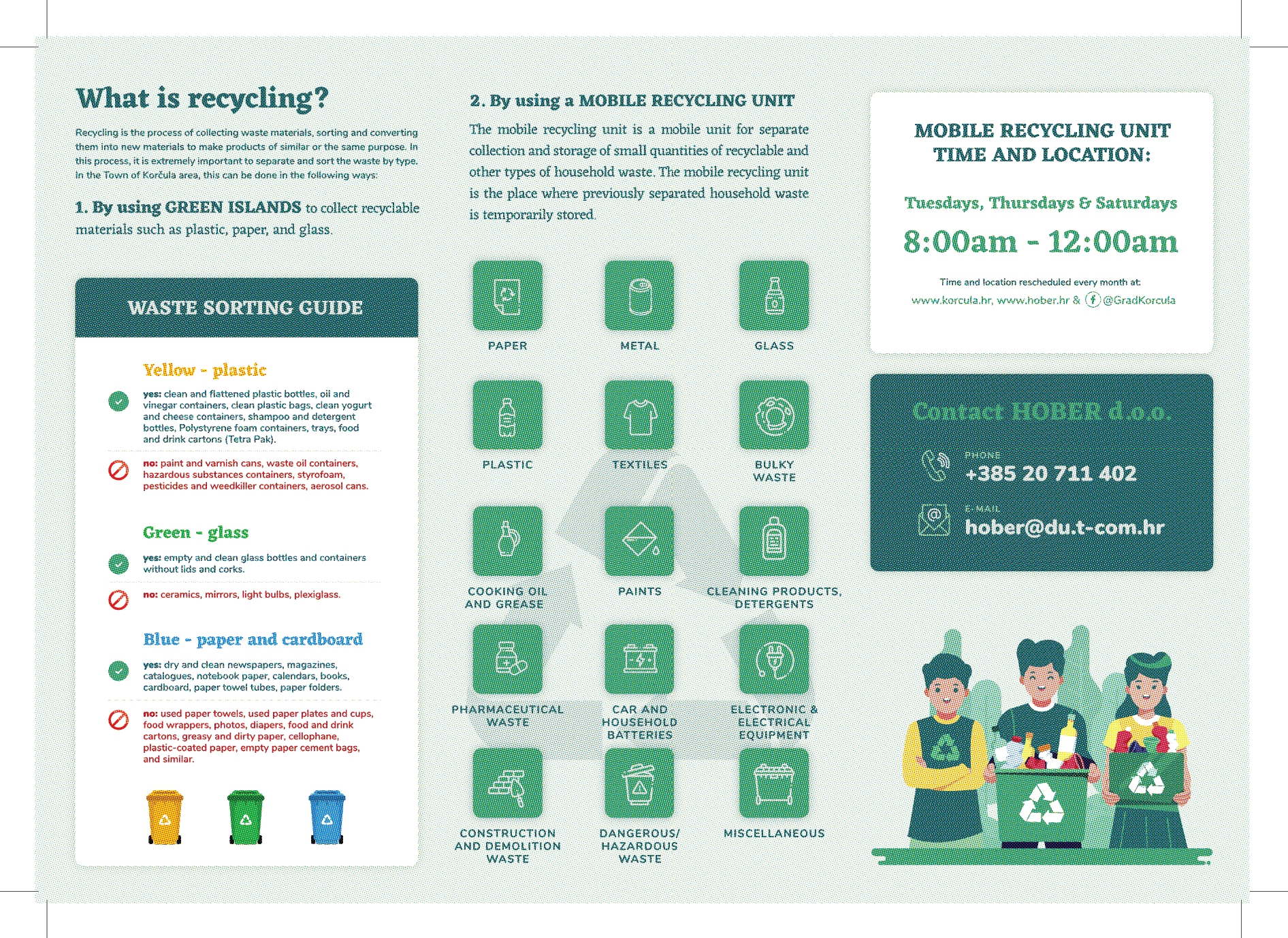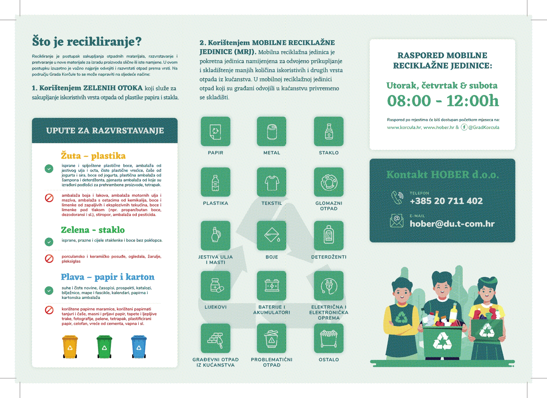 Mobilna reciklažna jedinica je pokretna jedinica koja služi za odvojeno prikupljanje i privremeno skladištenje manjih količina posebnih vrsta otpada, prilagođena je za prevoženje sa kamionom „navlakačem“ kojim raspolaže KTD Hober d.o.o., tako da će biti dostupna po svim mjestima Grada Korčule. Građani će moći uz prisustvo operatera koji zaprima otpad od građana i pohranjuje ga u spremnike, predati spomenuti otpad u MRJ na lokacijama na kojima će se prema utvrđenom rasporedu nalaziti MRJ, o čemu će građani biti pravovremeno obaviješteni.