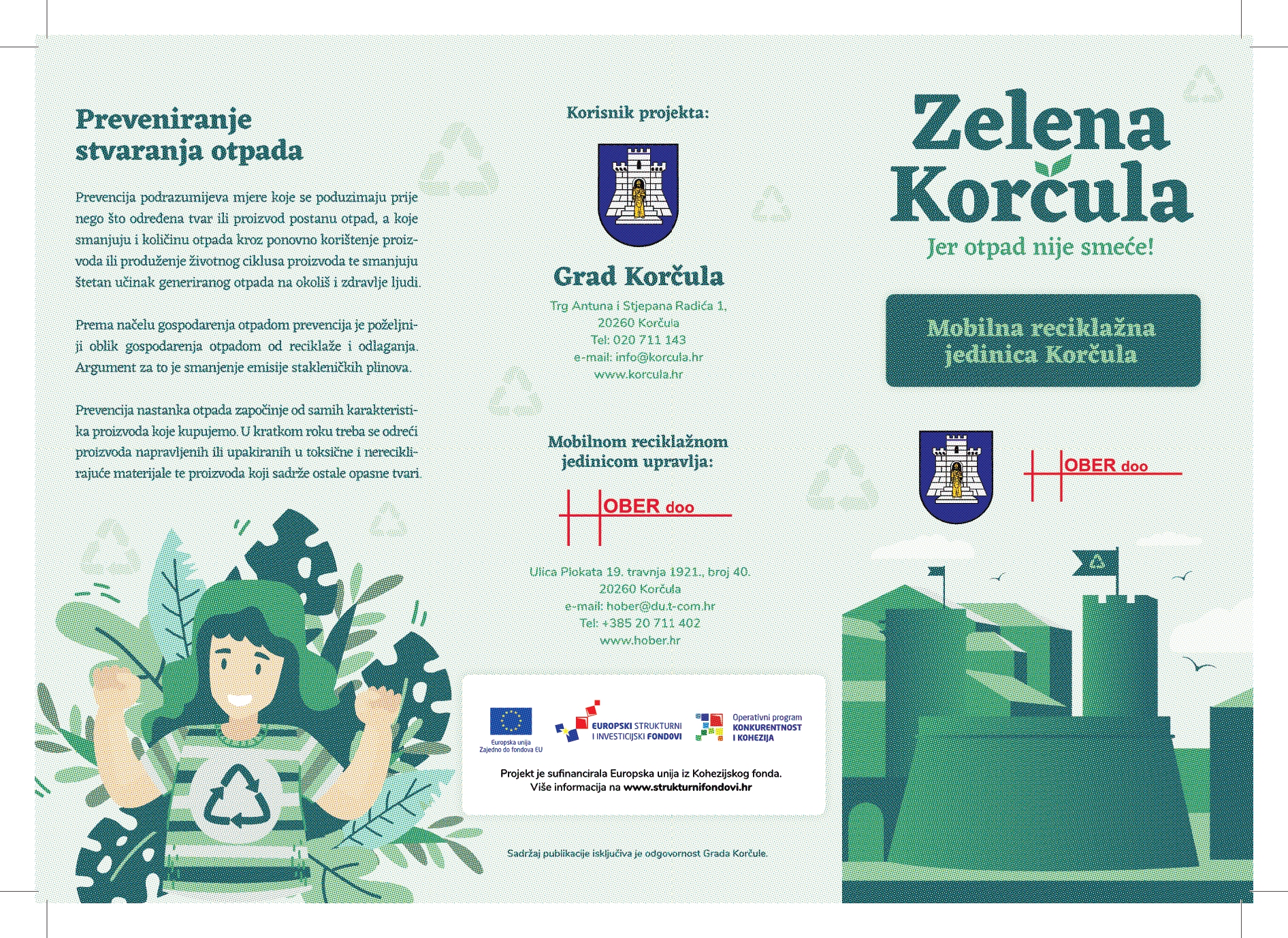 Projekt “Nabava mobilne reciklažne jedinice za Grad Korčulu” prijavljen je na Poziv za dostavu projektnih prijedloga “Uspostava reciklažnih dvorišta” Ministarstva zaštite okoliša i energetike. Odlukom o financiranju Gradu Korčuli odobreno je 136.250,00 HRK za nabavu mobilne reciklažne jedinice. Stopa sufinanciranja prihvatljivih troškova iz Kohezijskog fonda iznosi 85% ili 115.812,49 HRK.