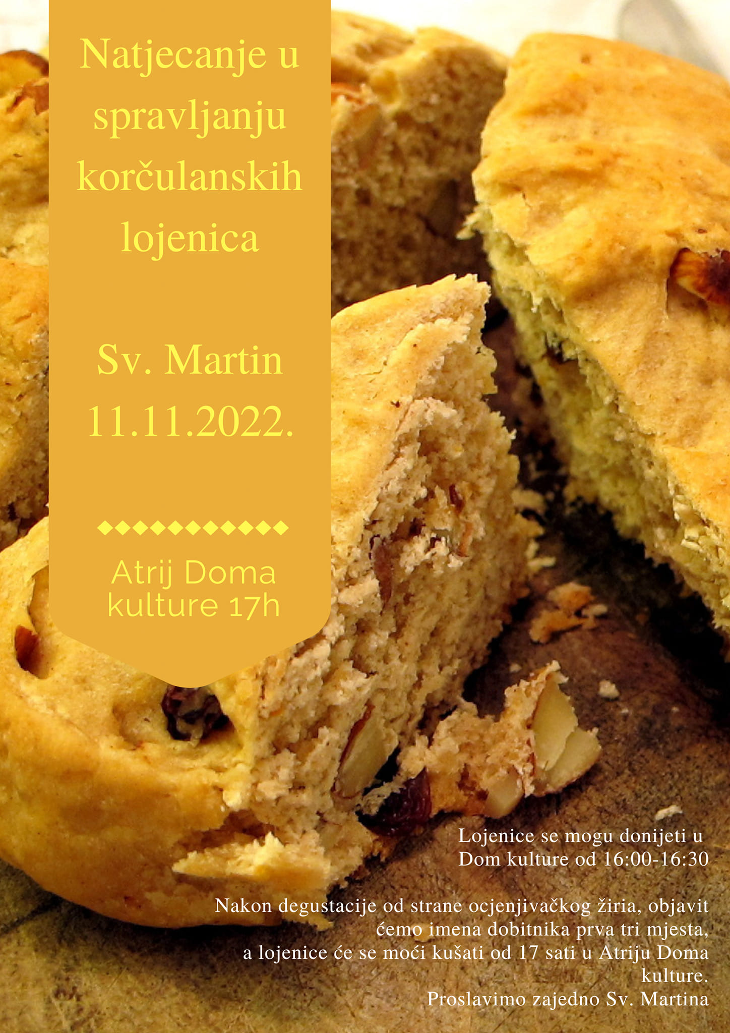 Centar za kulturu Korčula i ove godine organizira natjecanje u spravljanju korčulanskih lojenica na dan sv. Martina, 11.11. u Atriju Doma kulture u 17 sati.