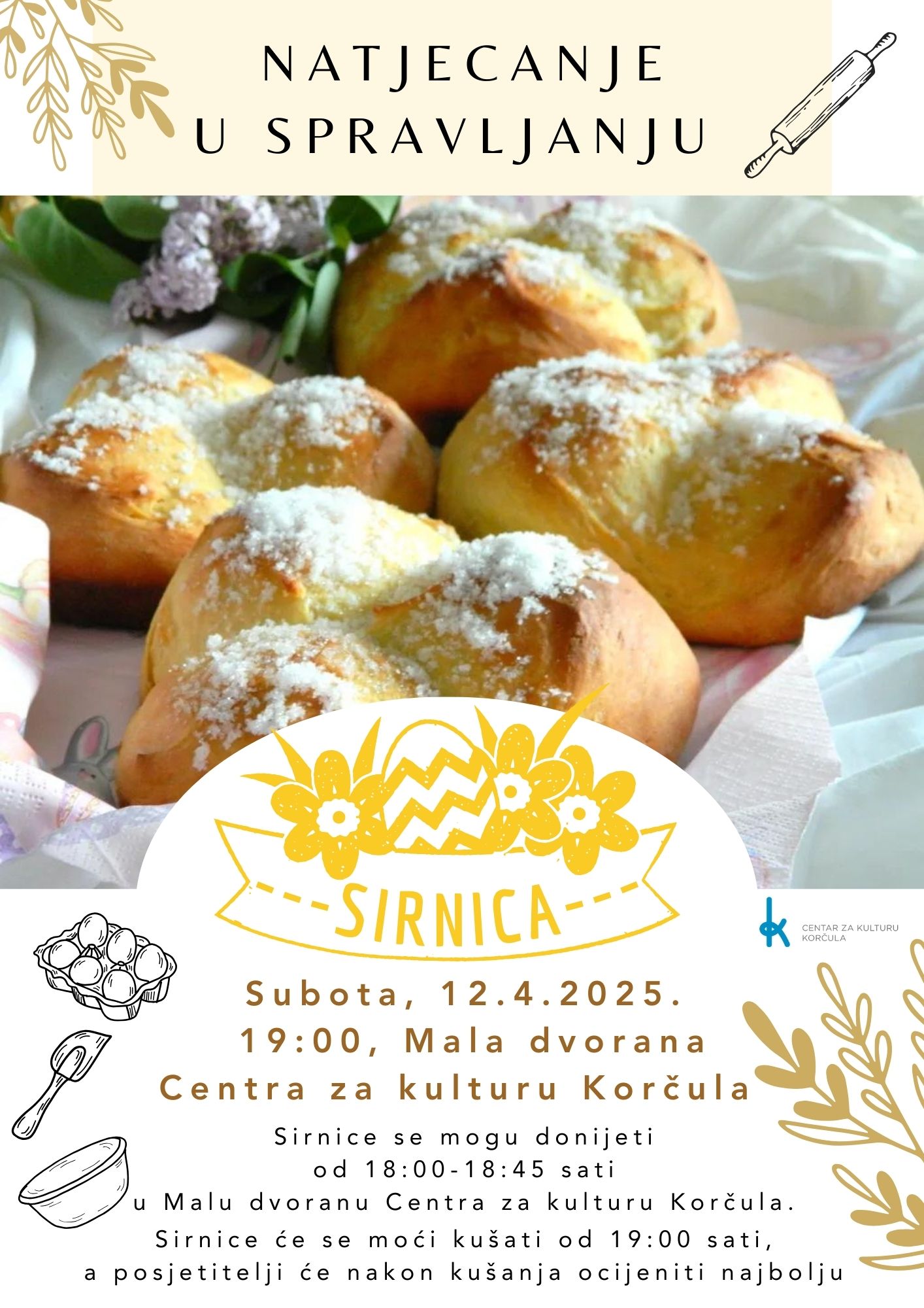 Centar za kulturu Korčula i ovu godinu poziva vas na natjecanje u spravljanju sirnica koje će se održati u maloj dvorani Centra za kulturu u subotu, 12. travnja 2025. godine.