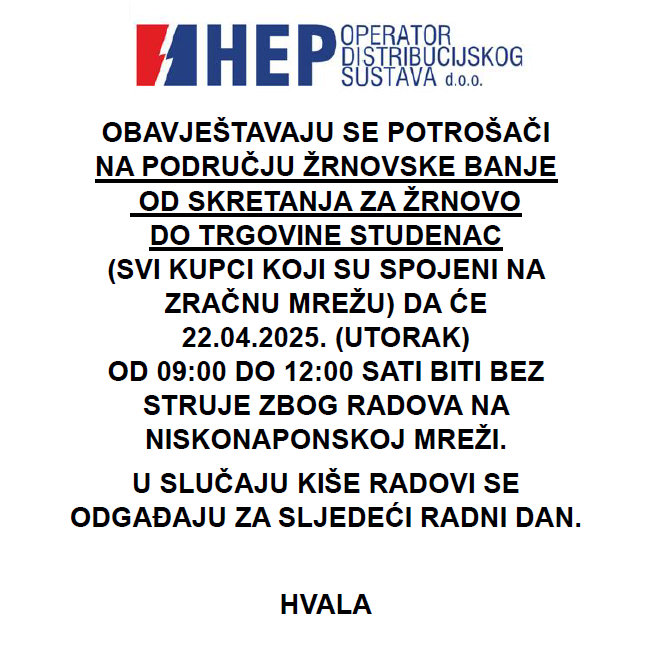 Obavještavaju se potrošači na području Žrnovske banje od skretanja za Žrnovo do trgovine Studenac (svi kupci koji su spojeni na zračnu mrežu) da će 22.04.2025 (utorak) od 09:00 do 12:00 sati biti bez struje zbog radova na niskonaponskoj mreži.