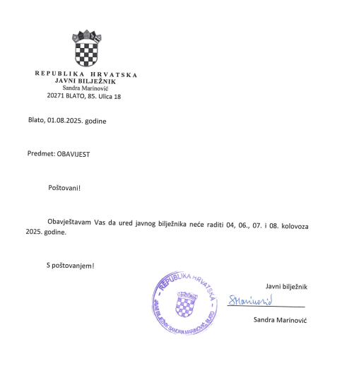 Ured javnog bilježnika u Blatu neće raditi 04., 06., 07. i 08. kolovoza 2025. godine.