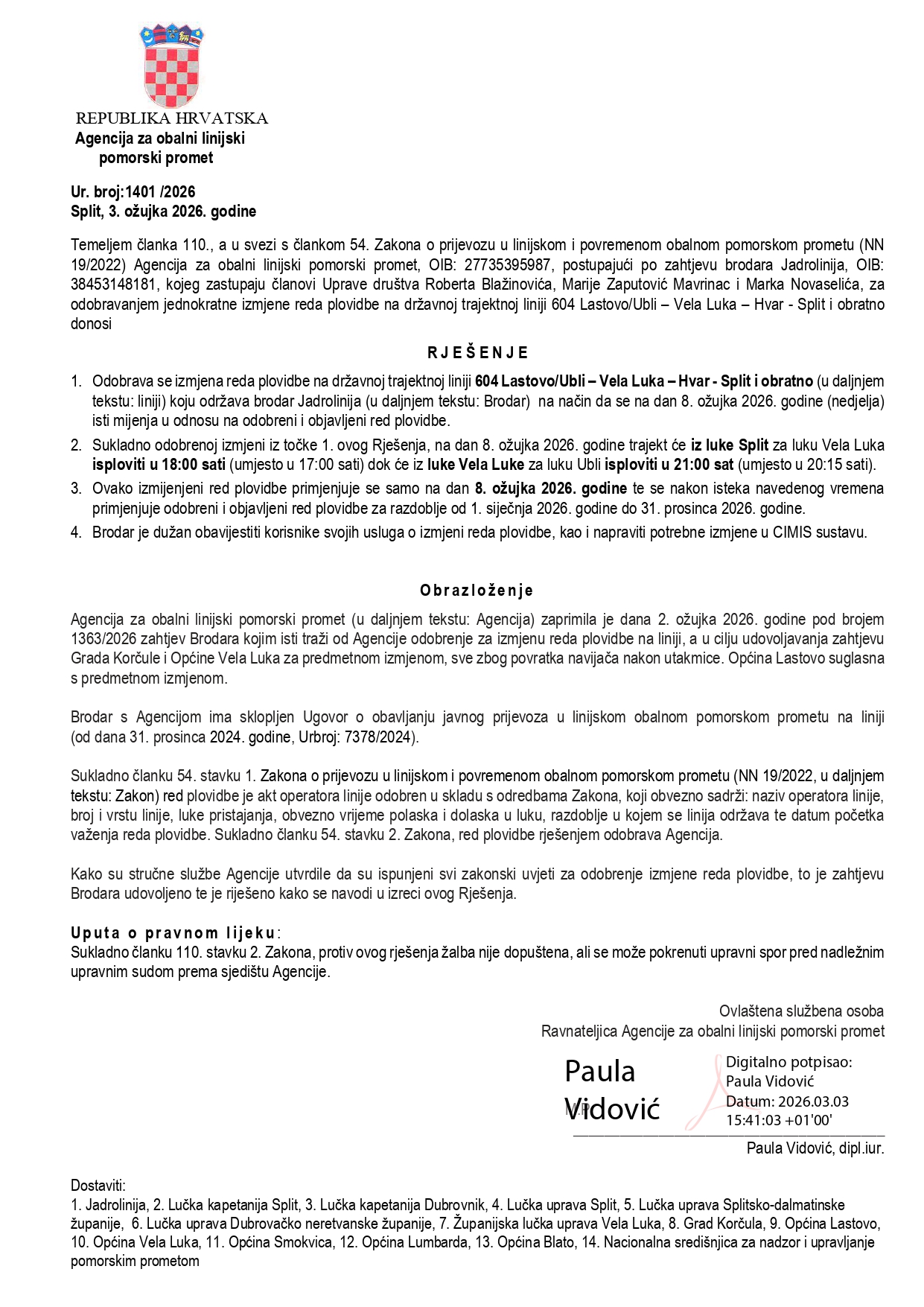 U nedjelju, 8. ožujka 2026. godine trajekt će iz luke Split za luku Vela Luka isploviti u 18:00 sati (umjesto u 17:00 sati) dok će iz luke Vela Luka za luku Ubli isploviti u 21:00 sat (umjesto u 20:15 sati).