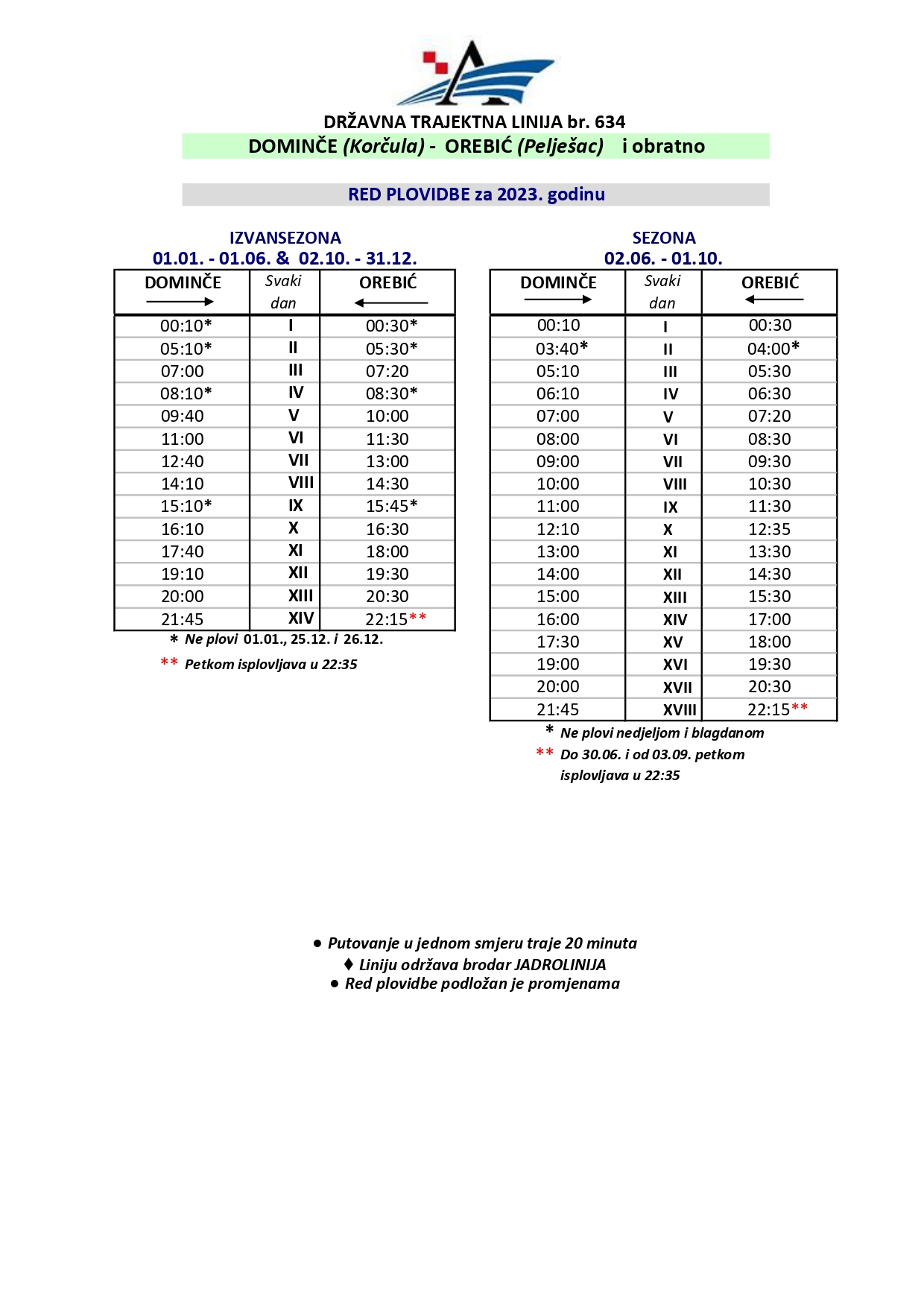 Agencija za obalni linijski pomorski promet donijela je Rješenje kojim se odobrava red plovidbe na državnoj trajektnoj liniji 634 Dominče – Orebić koji održava brodar Jadrolinija na način da se od 20. siječnja 2023. isti mijenja u odnosu na odobreni i objavljeni red plovidbe.