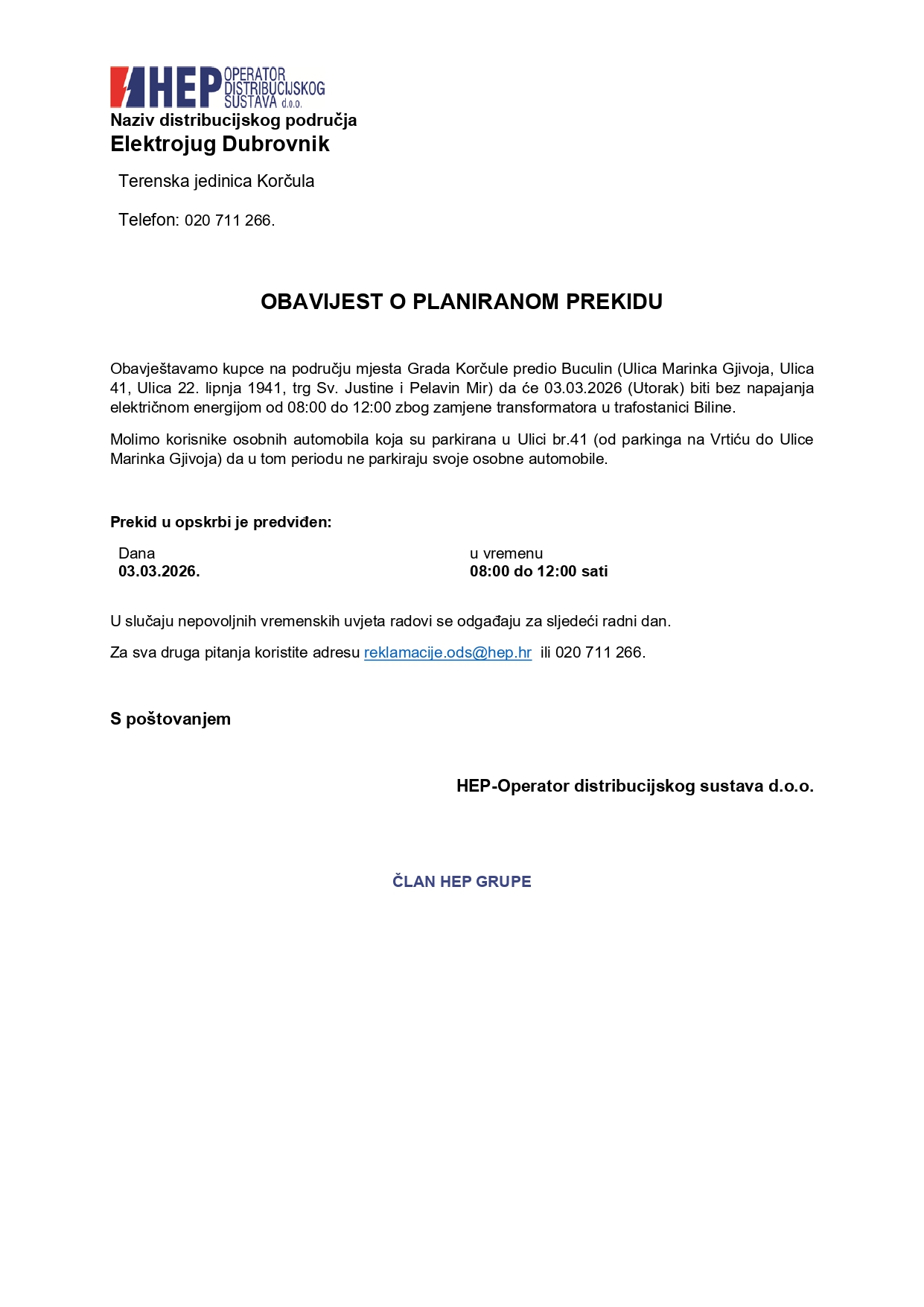 Obavještavaju se potrošači na području Grada Korčule predio Buculin (Ulica Marinka Gjivoja, Ulica 41, Ulica 22. lipnja 1941, trg Sv. Justine i Pelavin Mir) da će 03.03.2026. (utorak) biti bez napajanja električnom energijom od 08:00 do 12:00 sati zbog zamjene transformatora u trafostanici Biline.