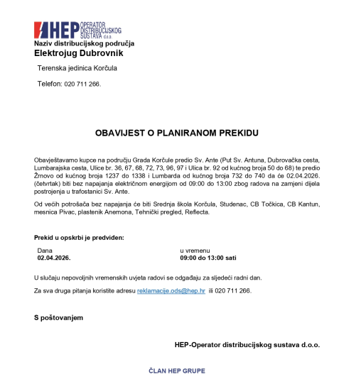 Obavještavamo kupce na području Grada Korčule predio Sv. Ante (Put Sv. Antuna, Dubrovačka cesta, Lumbarajska cesta, Ulice br. 36, 67, 68, 72, 73, 96, 97 i Ulica br. 92 od kućnog broja 50 do 68) te predio Žrnovo od kućnog broja 1237 do 1338 i Lumbarda od kućnog broja 732 do 740 da će 02.04.2026. (četvrtak) biti bez napajanja električnom energijom od 09:00 do 13:00 zbog radova na zamjeni dijela postrojenja u trafostanici Sv. Ante.