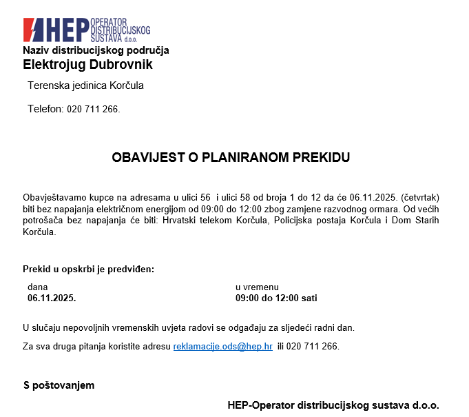 Obavijest o privremenom prekidu opskrbe električnom energijom