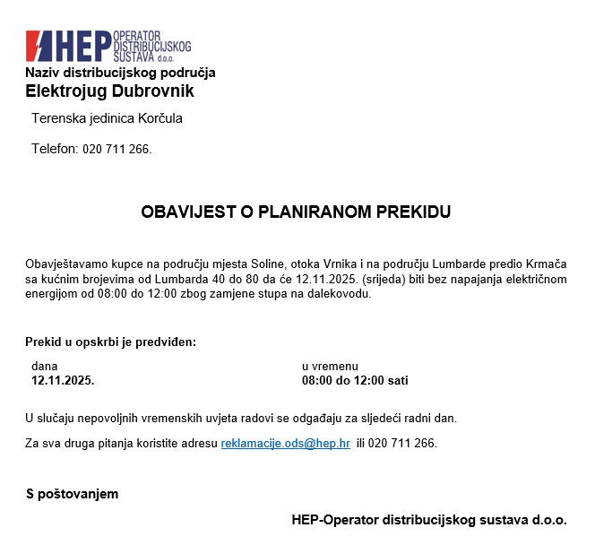 Obavještavaju se potrošači na području mjesta Soline, otoka Vrnika i na području Lumbarde predio Krmača sa kućnim brojevima od Lumbarda 40 do 80 da će 12.11.2025. (srijeda) biti bez napajanja električnom energijom od 08:00 do 12:00 zbog zamjene stupa na dalekovodu.