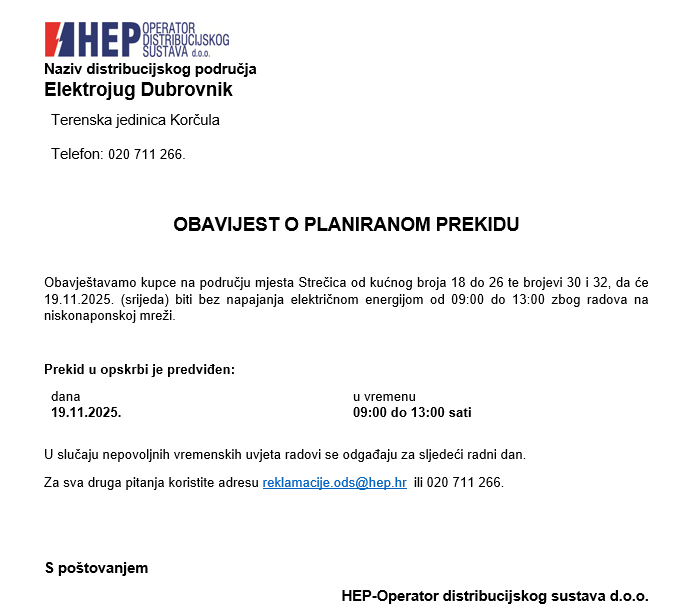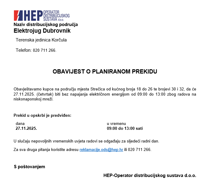 Obavještavaju se potrošači na području mjesta Strečica od kućnog broja 18 do 26 te brojevi 30 i 32, da će 19.11.2025. (srijeda) biti bez napajanja električnom energijom od 09:00 do 13:00 zbog radova na niskonaponskoj mreži.