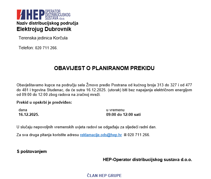 Obavještavaju se kupci na području Žrnova, predio Postrana od kućnog broja 313 do 327 i od 477 do 481 i trgovina Studenac, da će sutra 16.12.2025. (utorak) biti bez napajanja električnom energijom od 09:00 do 12:00 zbog radova na zračnoj mreži.