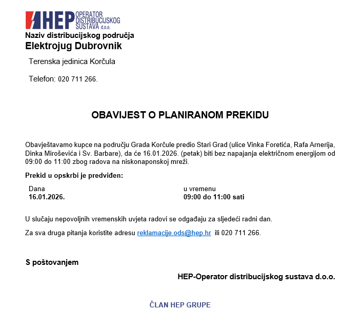 Obavještavaju se potrošači na području Grada Korčule predio Stari Grad (ulice Vinka Foretića, Rafa Arnerija, Dinka Miroševića i Sv. Barbare), da će 16.01.2026. (petak) biti bez napajanja električnom energijom od 09:00 do 11:00 zbog radova na niskonaponskoj mreži.