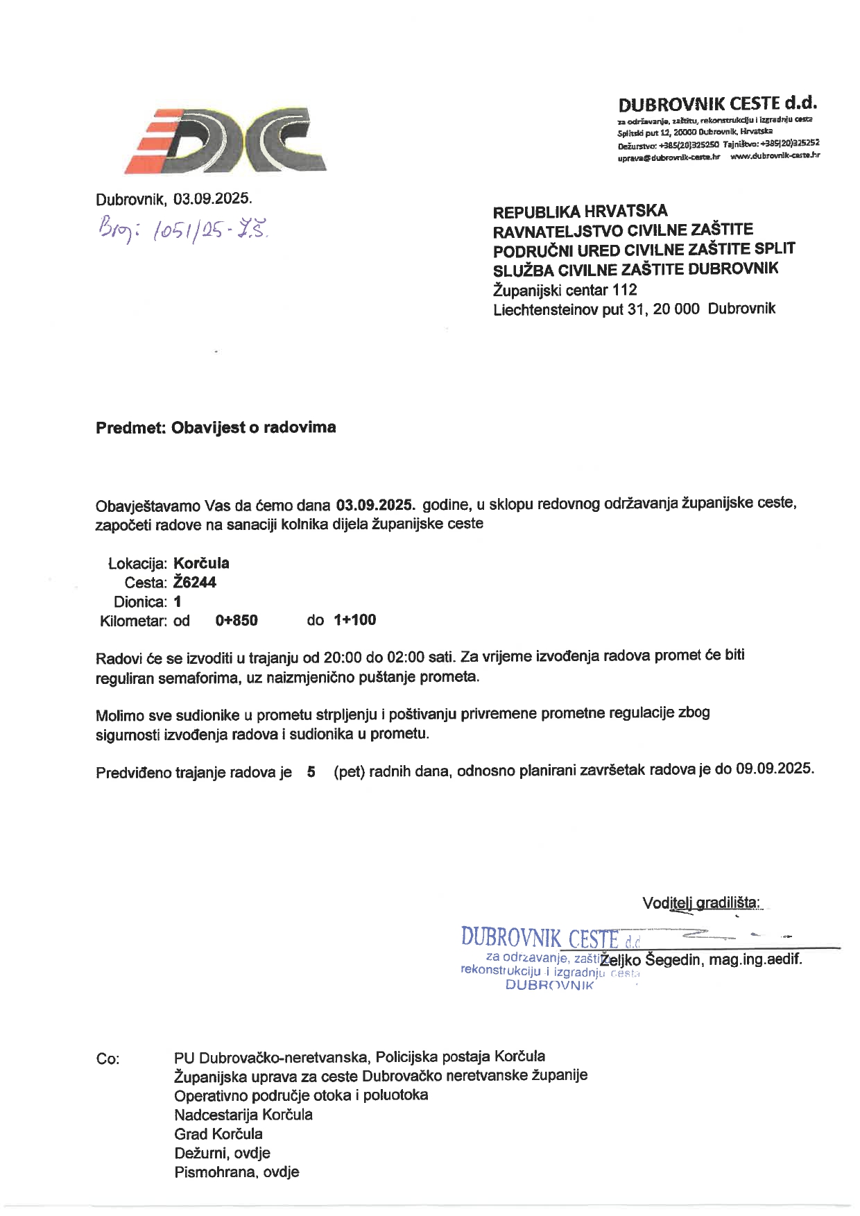 U sklopu redovnog održavanja županijske ceste danas, 3.9.2025. godine započeti će radovi na sanaciji kolnika dijela županijske ceste Ž6244 (Korčula, dionica 1, kilometar od 0+850 do 1+100).