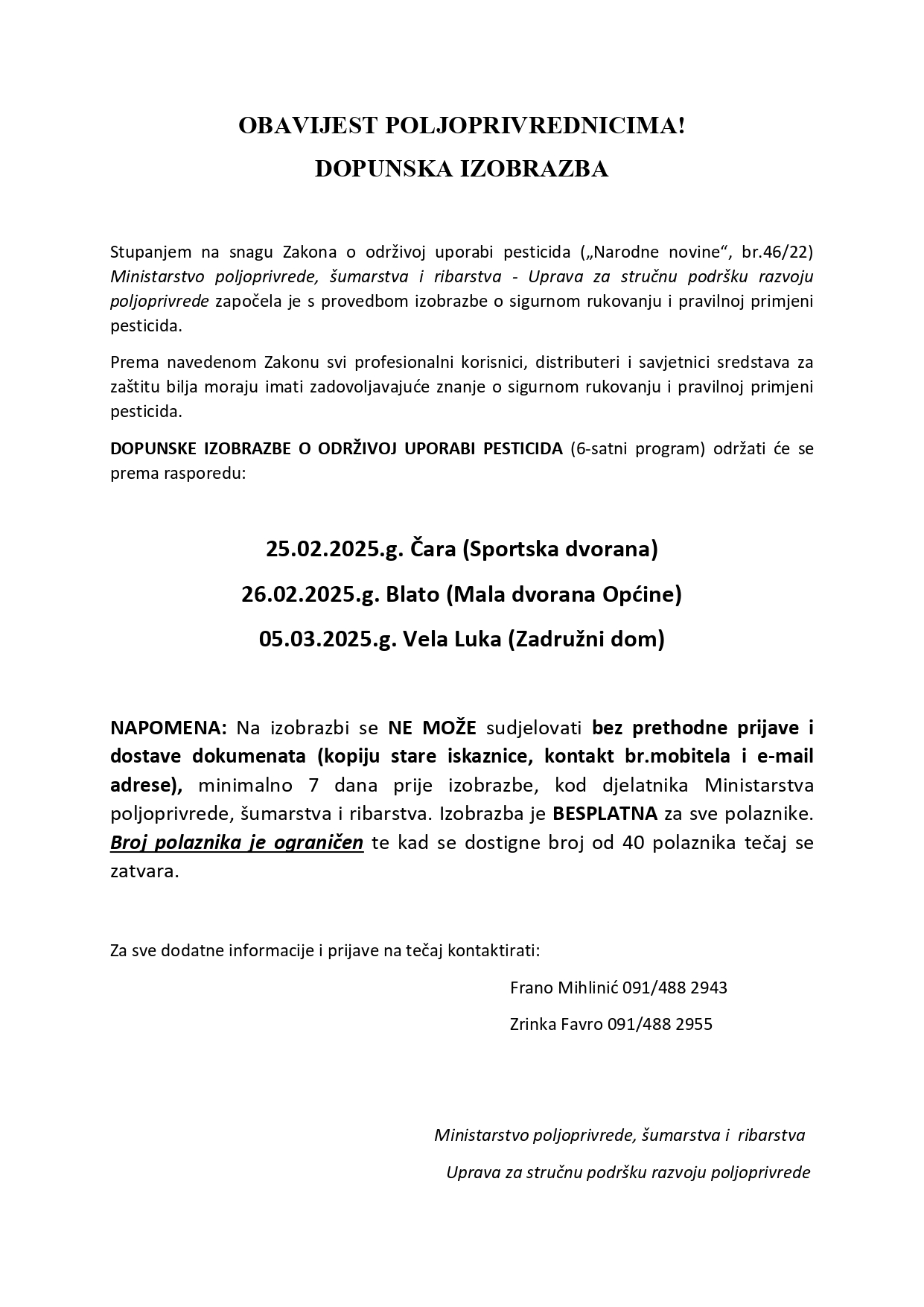 Ministarstvo poljoprivrede, šumarstva i ribarstva - Uprava za stručnu podršku razvoju poljoprivrede poziva zainteresirane na tečaj dopunska izobrazba o sigurnom rukovanju i pravilnoj primjeni pesticida.