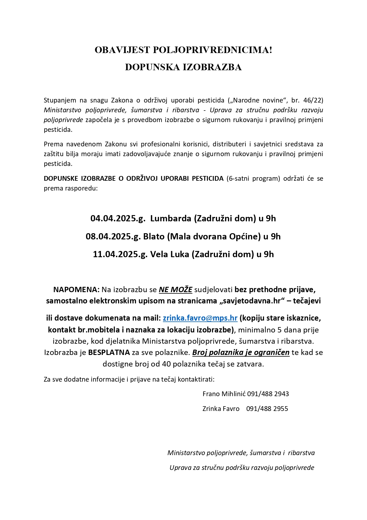 Ministarstvo poljoprivrede, šumarstva i ribarstva - Uprava za stručnu podršku razvoju poljoprivrede započela je s provedbom izobrazbe o sigurnom rukovanju i pravilnoj primjeni pesticida. Raspored održavanja programa pronađite u nastavku.