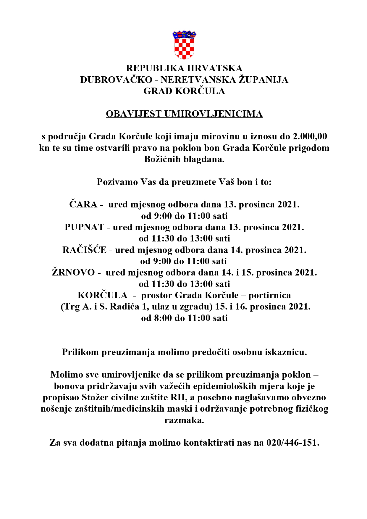 Obavijest umirovljenicima–Poziv na dodjelu poklon bona Grada Korčule prigodom Božićnih blagdana