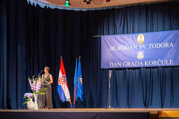 Pozdravne riječi svima okupljenima uputili su, saborska zastupnica Sandra Benčić, župan Dubrovačko-neretvanske županije Nikola Dobroslavić, izaslanik predsjednika Vlade, potpredsjednik Vlade i ministar prostornog uređenja, graditeljstva i državne imovine Branko Bačić, potpredsjednik Hrvatskog sabora Siniša Hajdaš Dončić, izaslanica predsjednika Republike Hrvatske, saborska zastupnica i gradonačelnica Supetra Ivana Marković. Svi su oni čestitali Dan Grada Korčule i također u svojim govorima su se osvrnuli na ovrhu koja prijeti Gradu Korčuli.