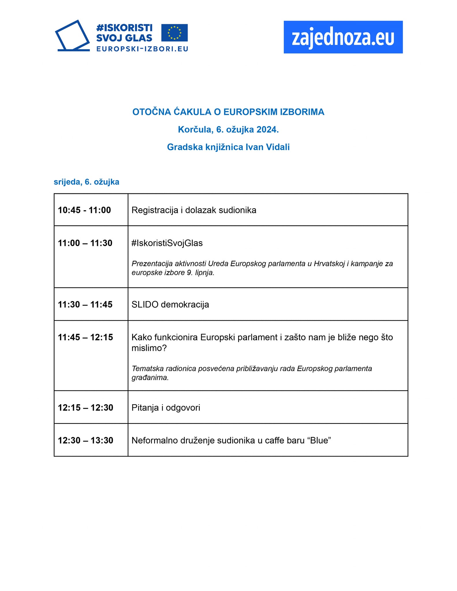 U duhu nadolazećih izbora za Europski parlament koji se u Hrvatskoj održavaju 9. lipnja 2024., Europe direct Korčula u suradnji s Uredom Europskog parlamenta u Hrvatskoj, organizira besplatnu interaktivnu radionicu “Otočna ćakula o europskim izborima”.