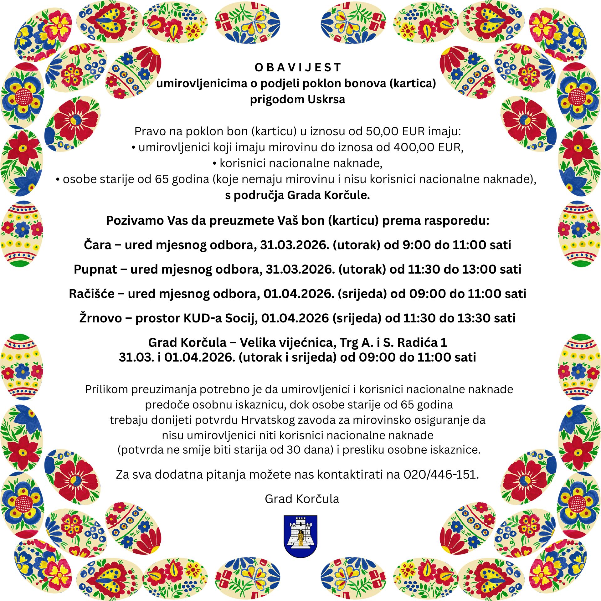 Grad Korčula ove godine osigurao je prigodne poklon bonove (kartice) u iznosu od 50,00 EUR za sve umirovljenike koji imaju mirovinu u iznosu do 400,00 EUR, korisnike nacionalne naknade te osobe starije od 65 godina (koje nemaju mirovinu i nisu korisnici nacionalne naknade), s područja Grada Korčule. Raspored podjele pronađite u nastavku.