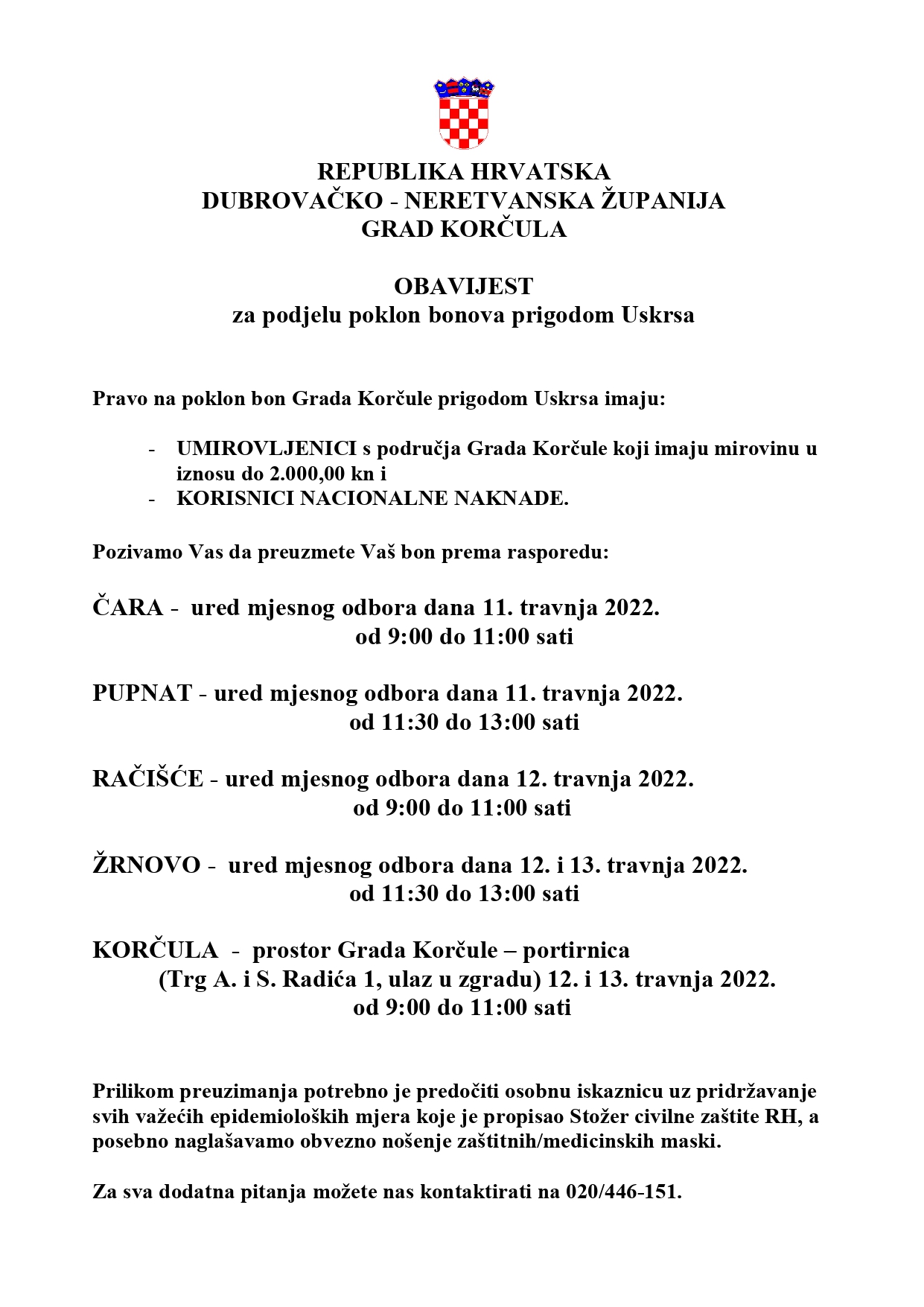 Umirovljenici s područja Grada Korčule koji imaju mirovinu u iznosu do 2.000,00 kn i korisnici nacionalne naknade ostvarili su pravo na poklon bon Grada Korčule prigodom Uskrsnih blagdana.