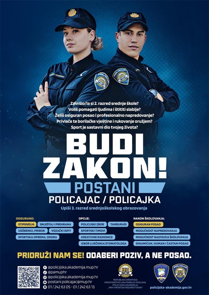 - Natječaj je dostupan na poveznici: Natječaj za upis učenika u III. razred Policijske škole „Josip Jović“ za stjecanje strukovne kvalifikacije za zanimanje policajac/policajka u 2025./2026. godini.