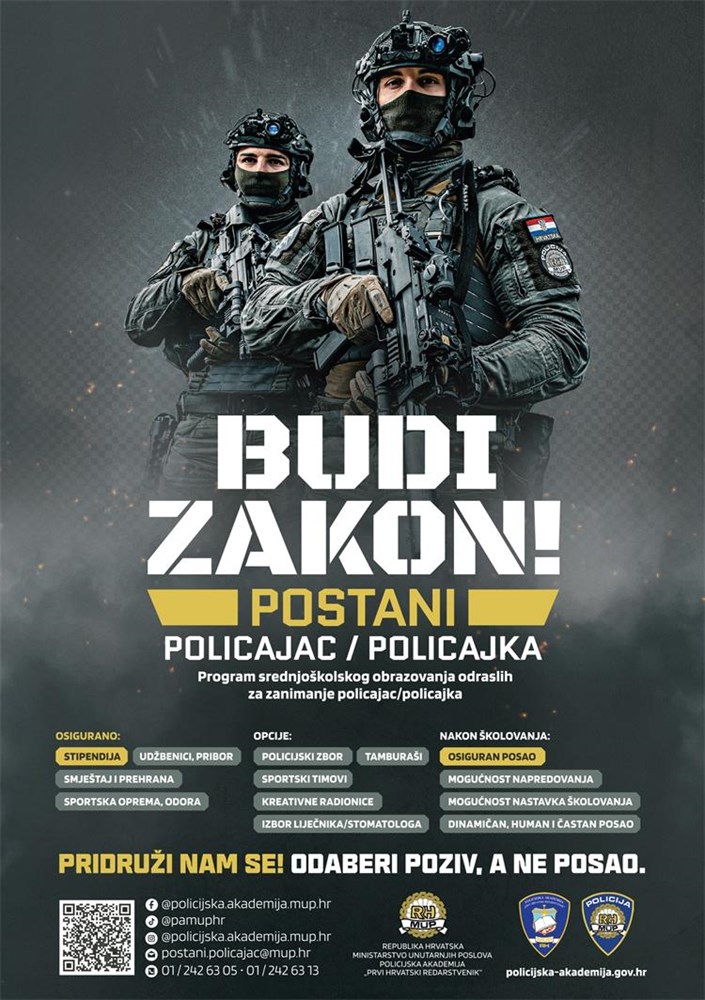 Ministarstvo unutarnjih poslova planira upis 550 polaznika/ca u Program srednjoškolskog obrazovanja odraslih za zanimanje policajac/ka u 2025./2026. godini.