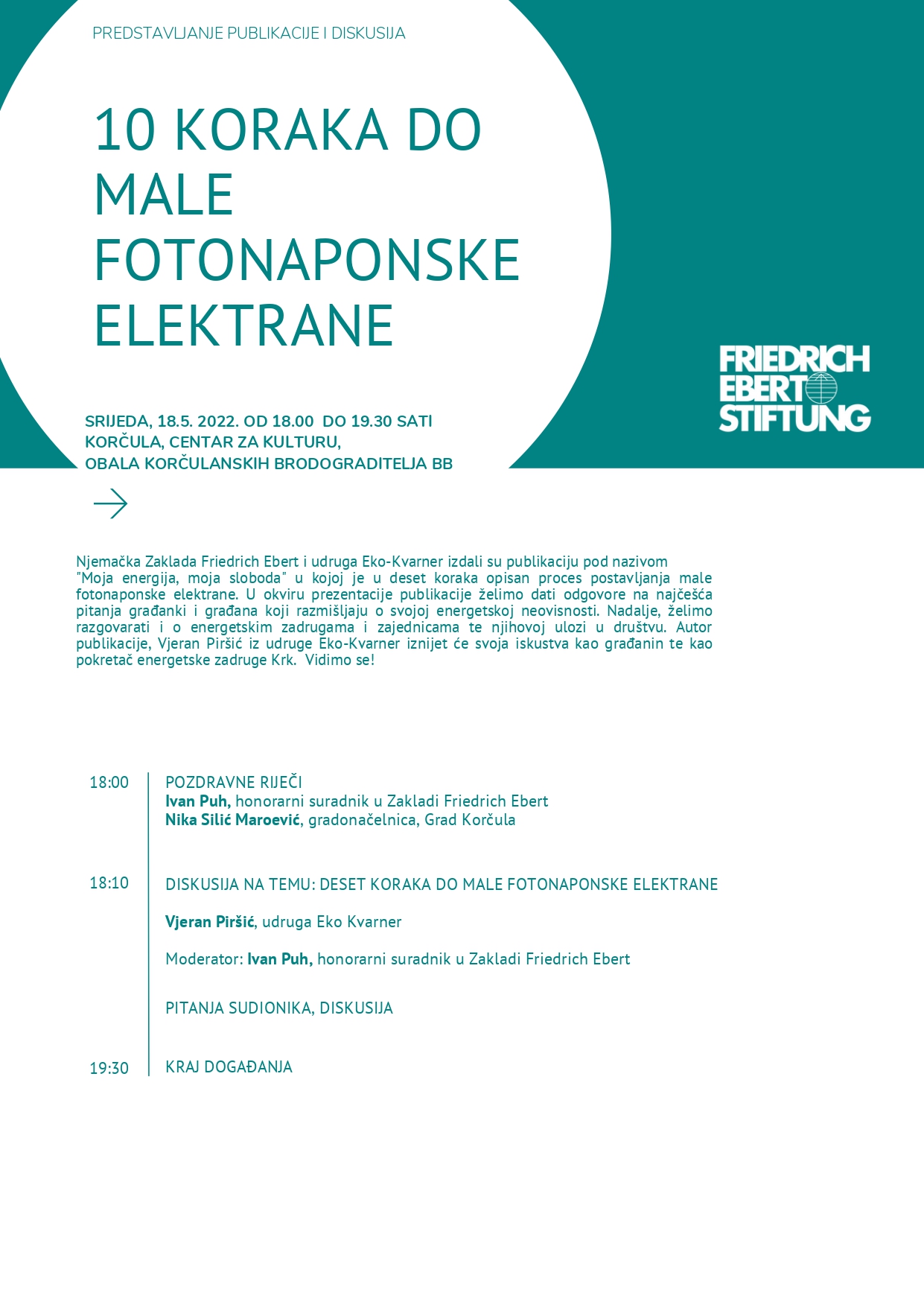 Njemačka Zaklada Friedrich Ebert i udruga Eko-Kvarner izdali su publikaciju pod nazivom “Moja energija, moja sloboda” u kojoj je u deset koraka opisan proces postavljanja male fotonaponske elektrane. U okviru prezentacije publikacije građani mogu dobiti odgovore na najčešća pitanja o svojoj energetskoj neovisnosti, kao i razgovarati o energetskim zadrugama i zajednicama te njihovoj ulozi u društvu. Autor publikacije, Vjeran Piršić iz udruge Eko-Kvarner iznijet će svoja iskustva kao građanin te kao pokretač energetske zadruge Krk.