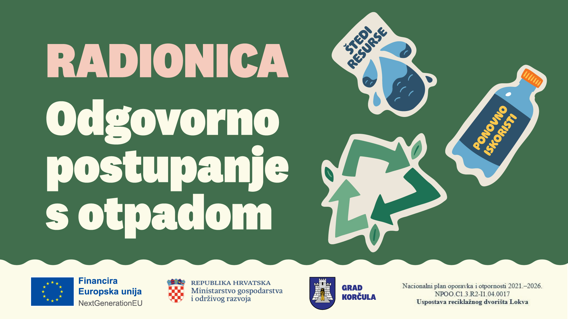 Radionice će se održati u sklopu projekta „𝑈𝑠𝑝𝑜𝑠𝑡𝑎𝑣𝑎 𝑟𝑒𝑐𝑖𝑘𝑙𝑎𝑧̌𝑛𝑜𝑔 𝑑𝑣𝑜𝑟𝑖𝑠̌𝑡𝑎 𝐿𝑜𝑘𝑣𝑎“ kao dio izobrazno informativnih aktivnosti o održivom gospodarenju otpadom.