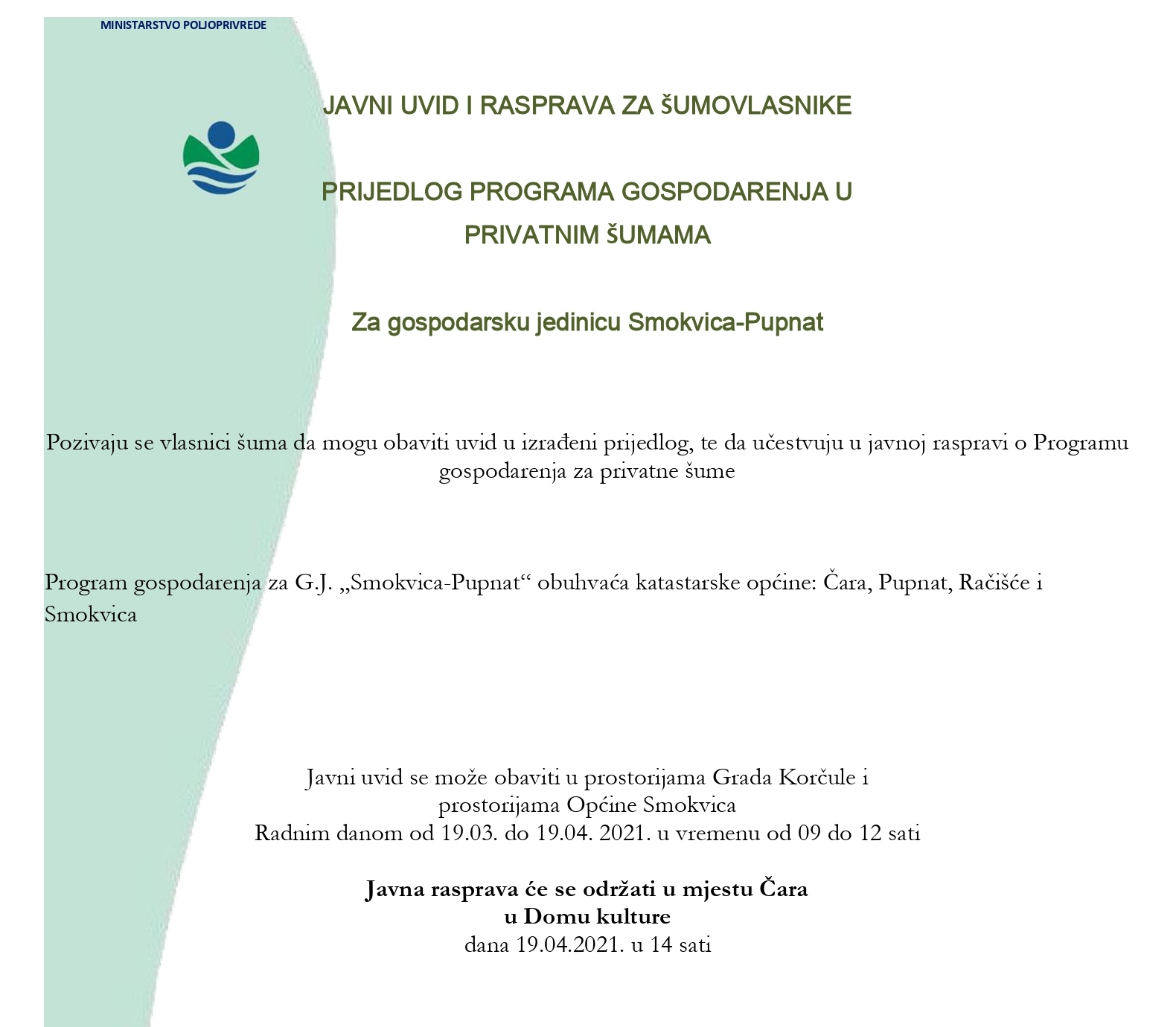 Pozivaju se vlasnici šuma za G.J. "Smokvica-Pupnat" da mogu obaviti uvid u izrađeni prijedlog, te da učestvuju u javnoj raspravi o Programu gospodarenja za privatne šume.