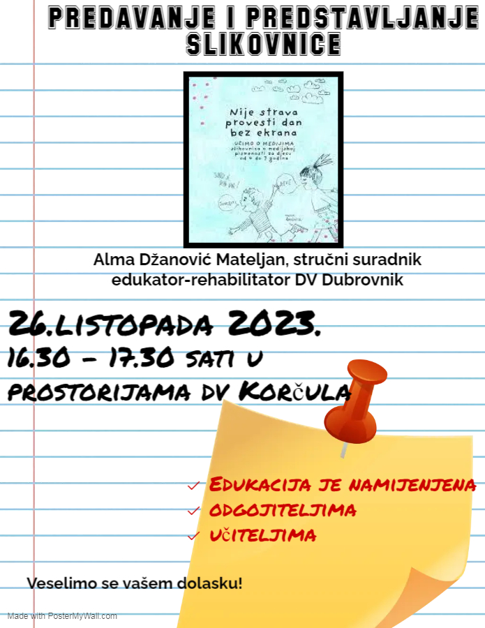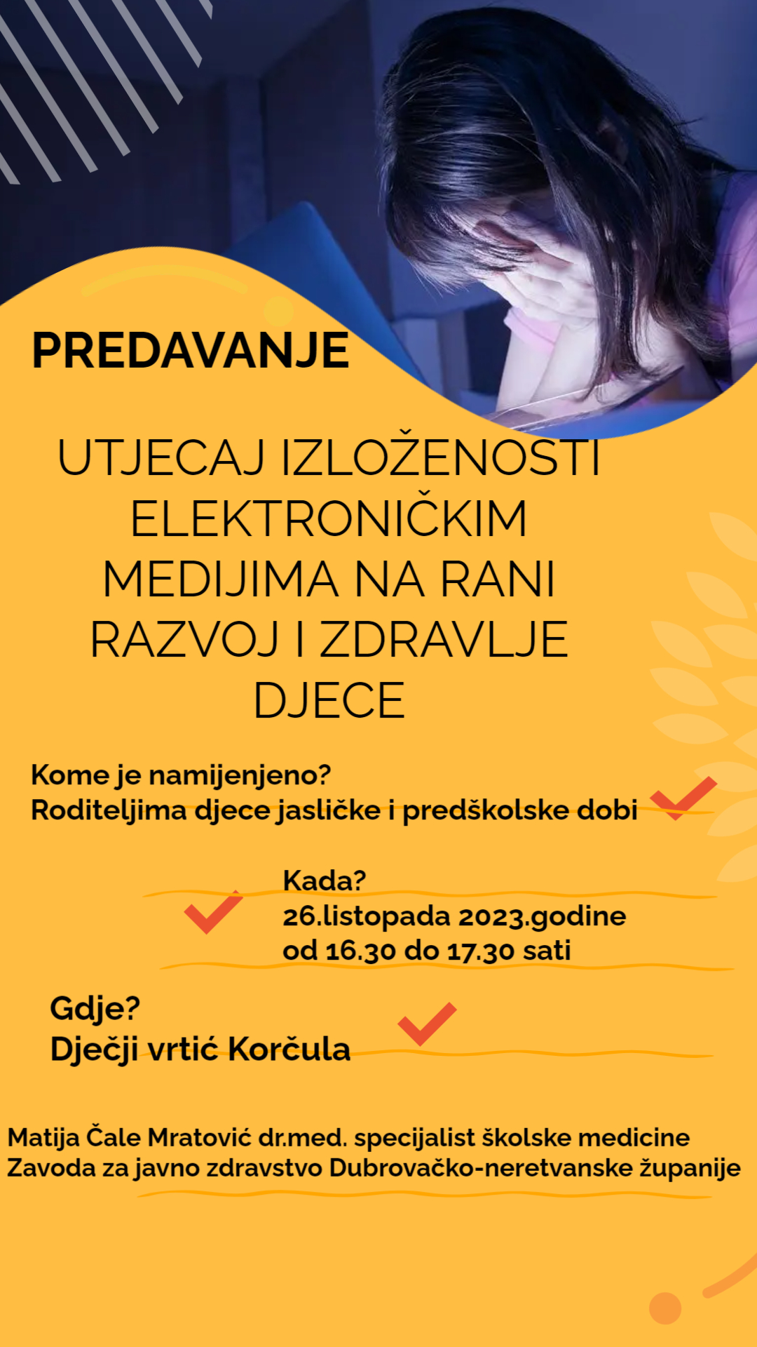 U Dječjem vrtiću Korčula, 26. listopada 2023. u 16.30, održat će se predavanje za roditelje i stručnjake koji rade s djecom predškolske i školske dobi.