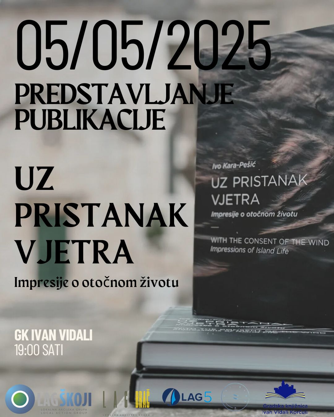 Lokalna akcijska grupa “LAG 5” organizira predstavljanje dvojezične publikacije "Uz pristanak vjetra - impresije o otočnom životu", koje će se održati u ponedjeljak, 5. svibnja 2025. godine u 19 sati, u Gradskoj knjižnici Ivan Vidali u Korčuli.
