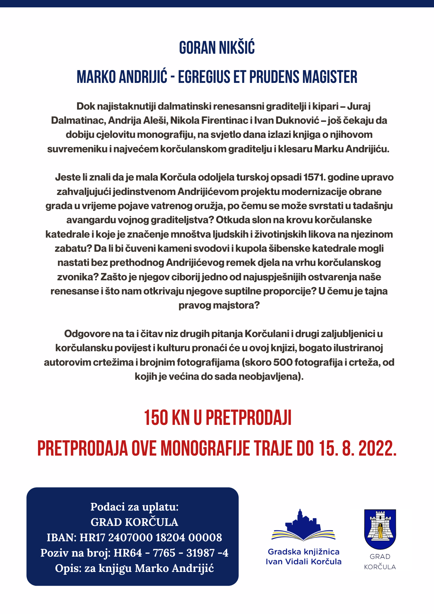 Pretprodaja ove monografije, po cijeni od 150,00 kn, traje do 15.8.2022. godine.