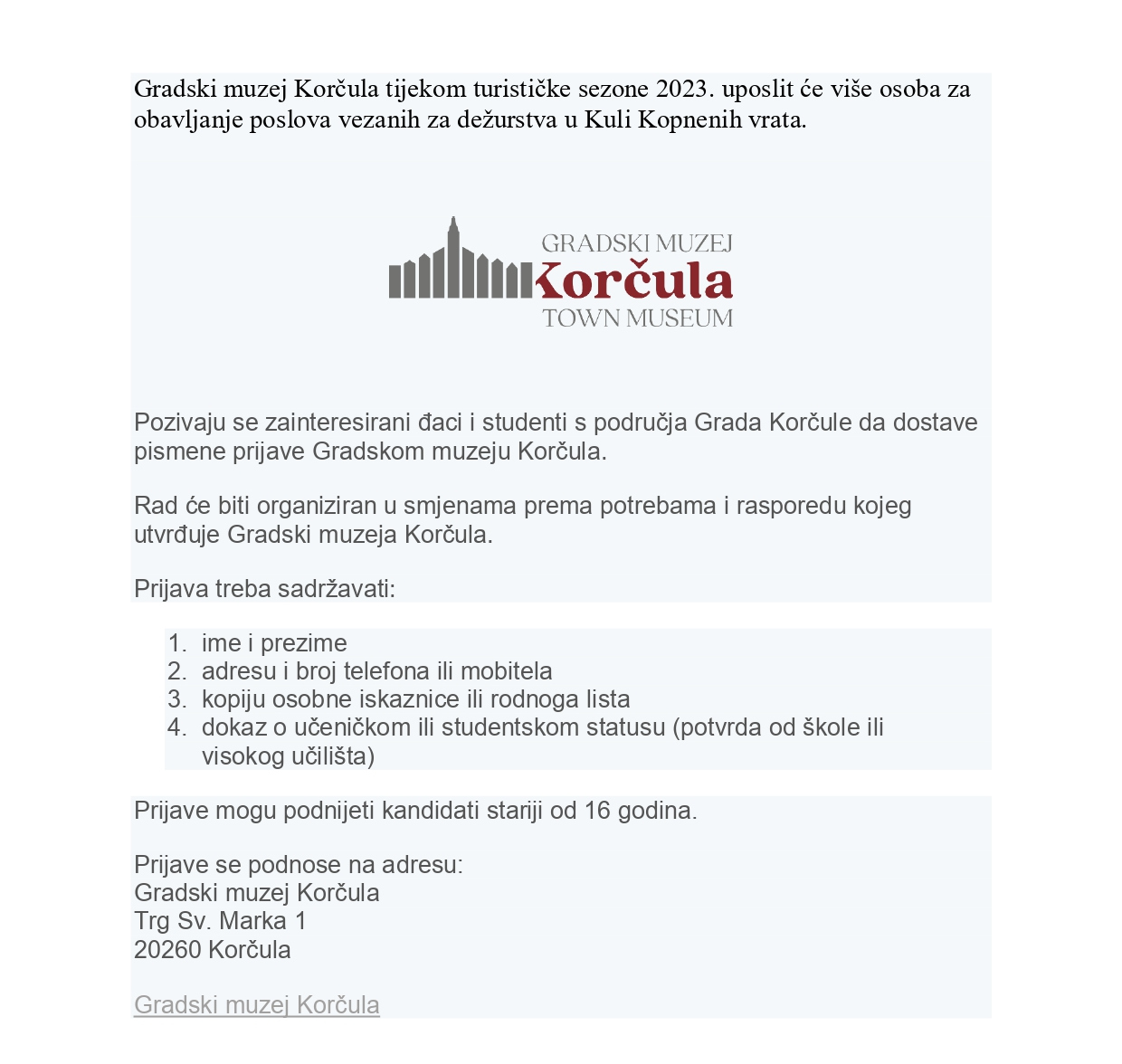 Gradski muzej Korčula tijekom turističke sezone 2023. zaposliti će više osoba za obavljanje poslova vezanih za dežurstva u Kuli Kopnenih vrata. Prijave se dostavljaju do 1. lipnja 2023. godine!
