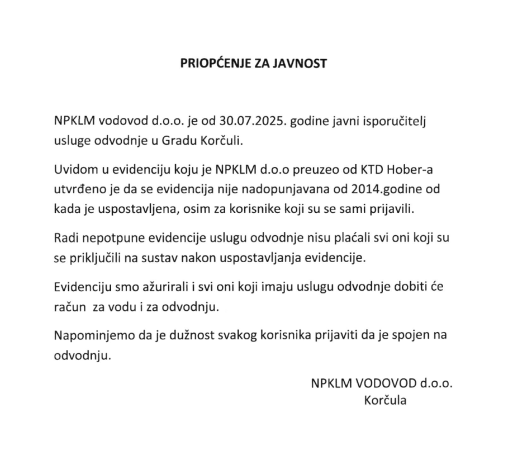 Za korisnike usluge odvodnje na području Grada Korčule.