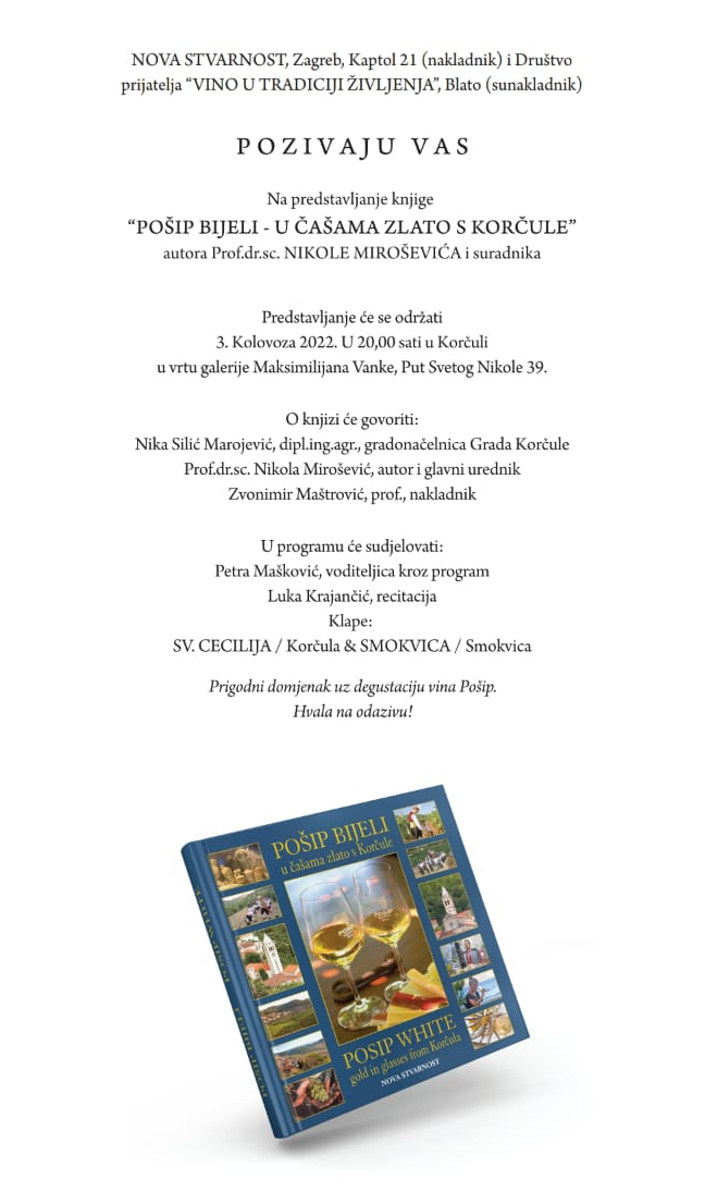 Predstavljanje knjige „Pošip bijeli – u čašama zlato s Korčule“ održati će se u srijedu, 03. kolovoza 2022. godine s početkom u 20:00 sati u vrtu galerije Maksimilijana Vanke.